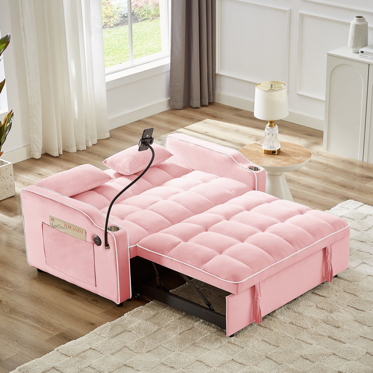 NEW 1 versatile foldable sofa bed in 3 lengths, modern sofa sofa sofa velvet pull-out bed, adjustable back and with USB port and ashtray and swivel phone stand (pink)