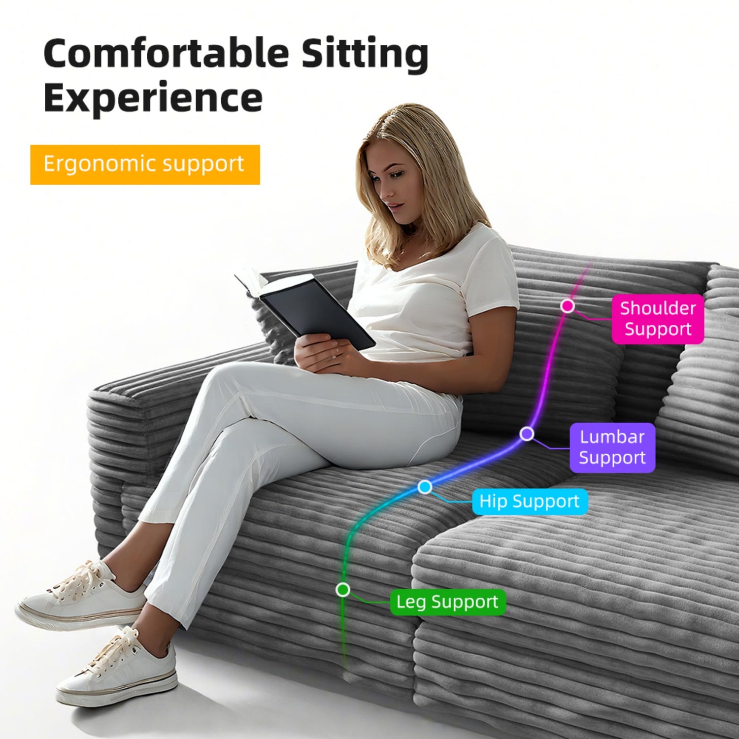 This sofa is designed for ultimate comfort, combining exquisite craftsmanship and user-friendly features to create a comprehensive relaxation experience for you. The sofa is filled with high-density sponge and high-quality cotton, paired with carefully designed rear pillows and luxurious cushions, providing unparalleled full body support. Whether it's reading or daily rest, you can enjoy cloud like comfort. Its sturdy solid wood frame and metal spring seat cushion can support up to 1000LB of weight, making it rock stable when used by four adults. The frame is durable and will not deform. The surface is made of skin friendly plush corduroy fabric, which feels soft as silk and has a unique texture. The accompanying multifunctional footstool can be freely adjusted in position, can extend into a segmented/U-shaped sofa, or can be used as a standalone footstool or small coffee table. The sofa can be easily converted into a recliner mode to meet various leisure scenes. Easy to install, assembly can be completed in just 10 minutes (note: vacuum packaged seat cushions need to be left to stand for 48 hours to restore their original state), showcasing quality in every detail from materials to functionality, redefining a comfortable home experience.