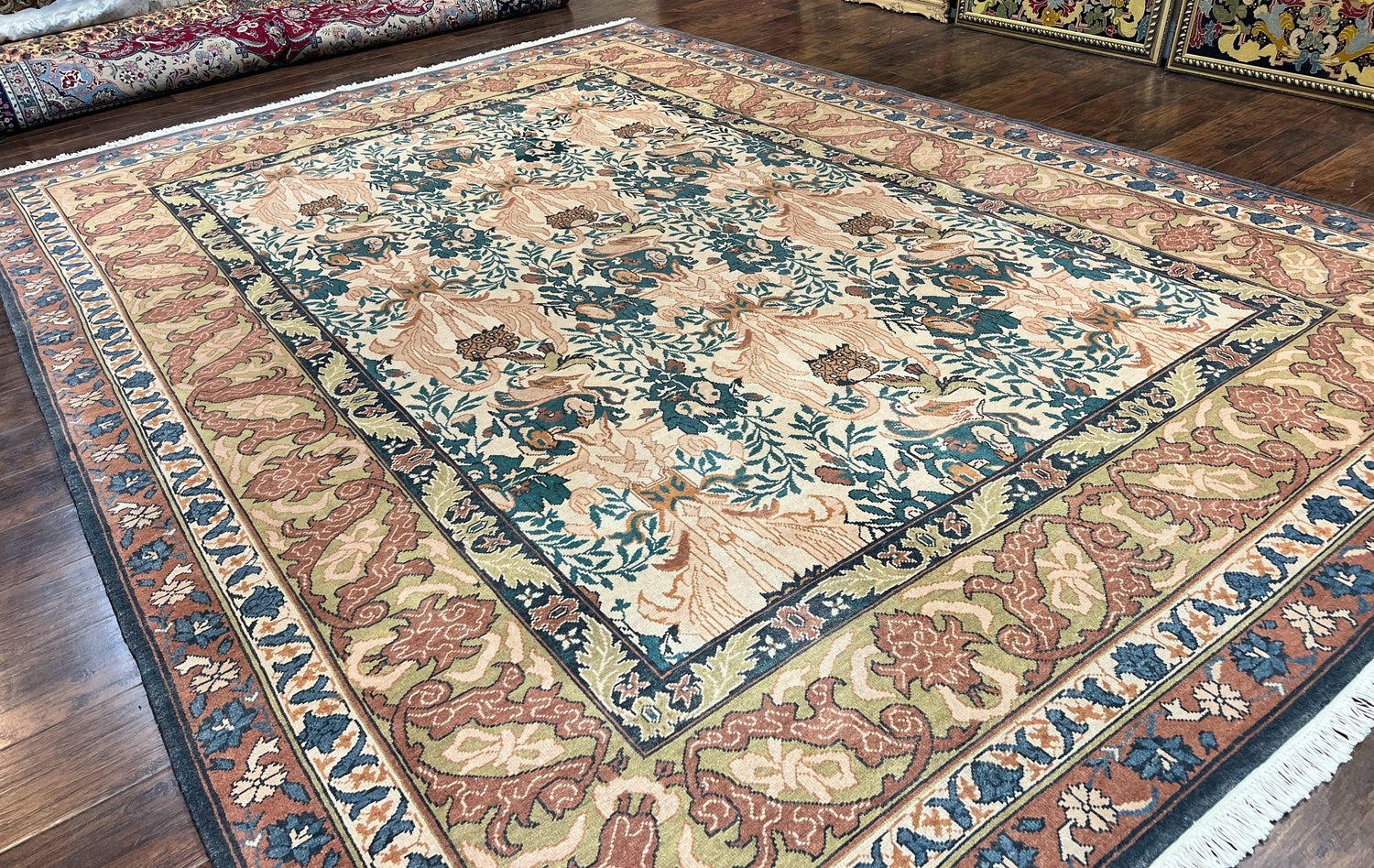USED 10x13 Wool Rug, Floral Pattern, Birds, Handmade Vintage Carpet, Couristan Rug, Beige