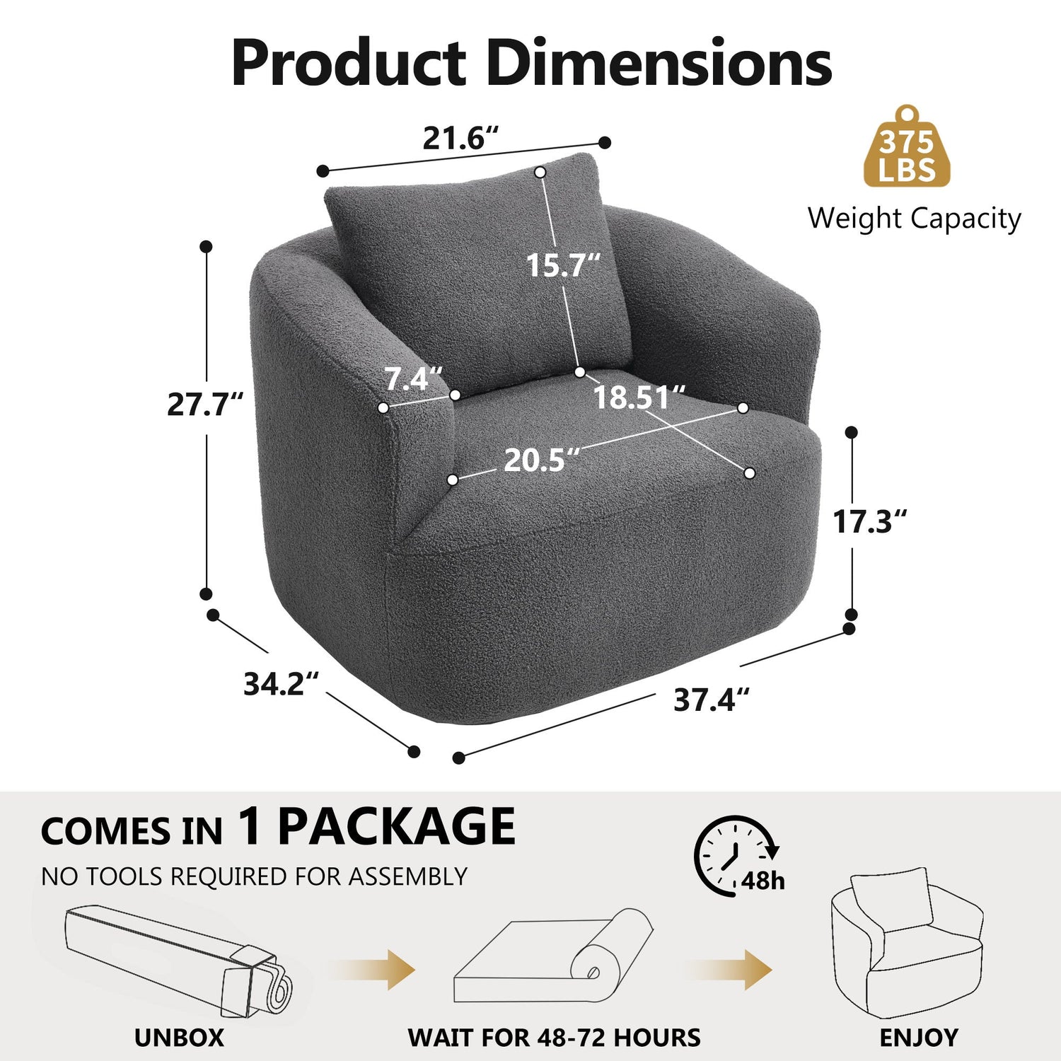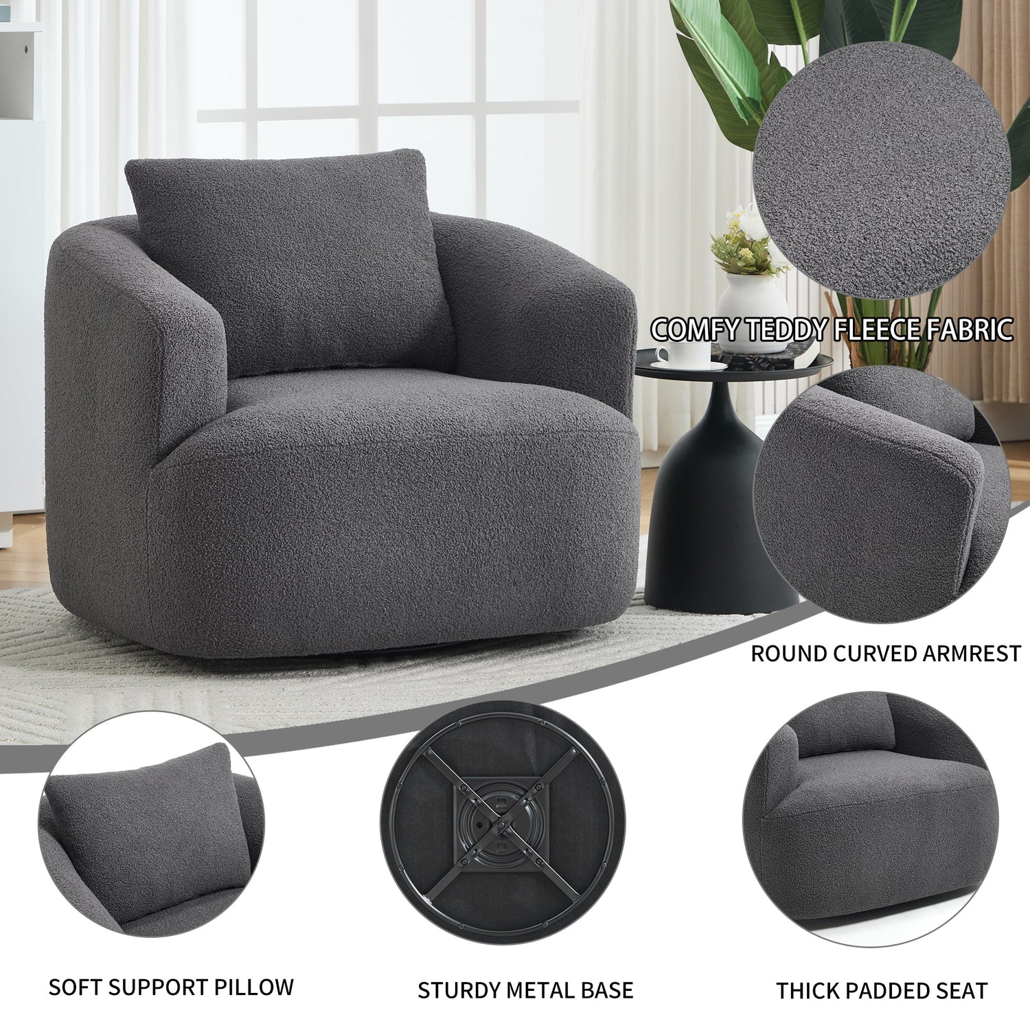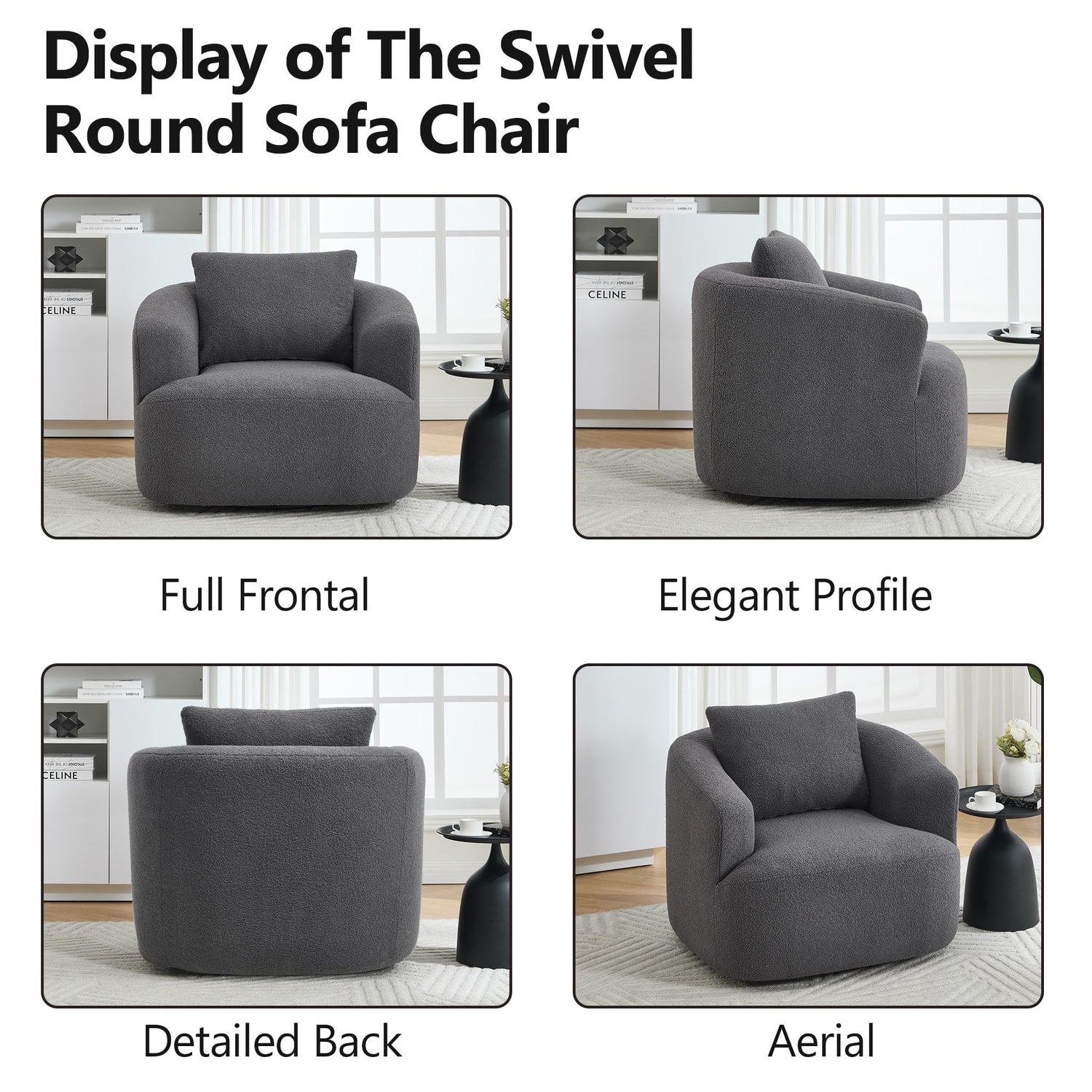 NEW 360° Swivel Round Upholstered Comfy Chair With One Soft Pillow, Teddy Fleece High-Resilience Sponge Single Sofa, No Assembly for Living Room, Bedroom, Apartment, Dark Grey.