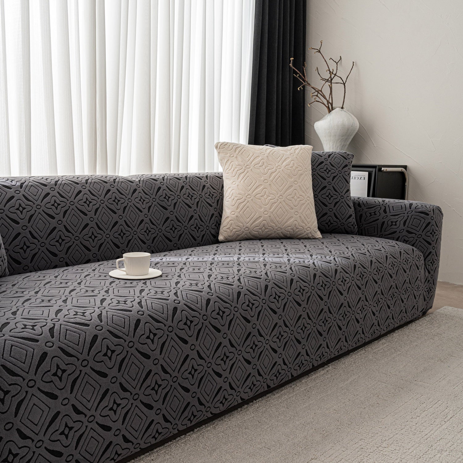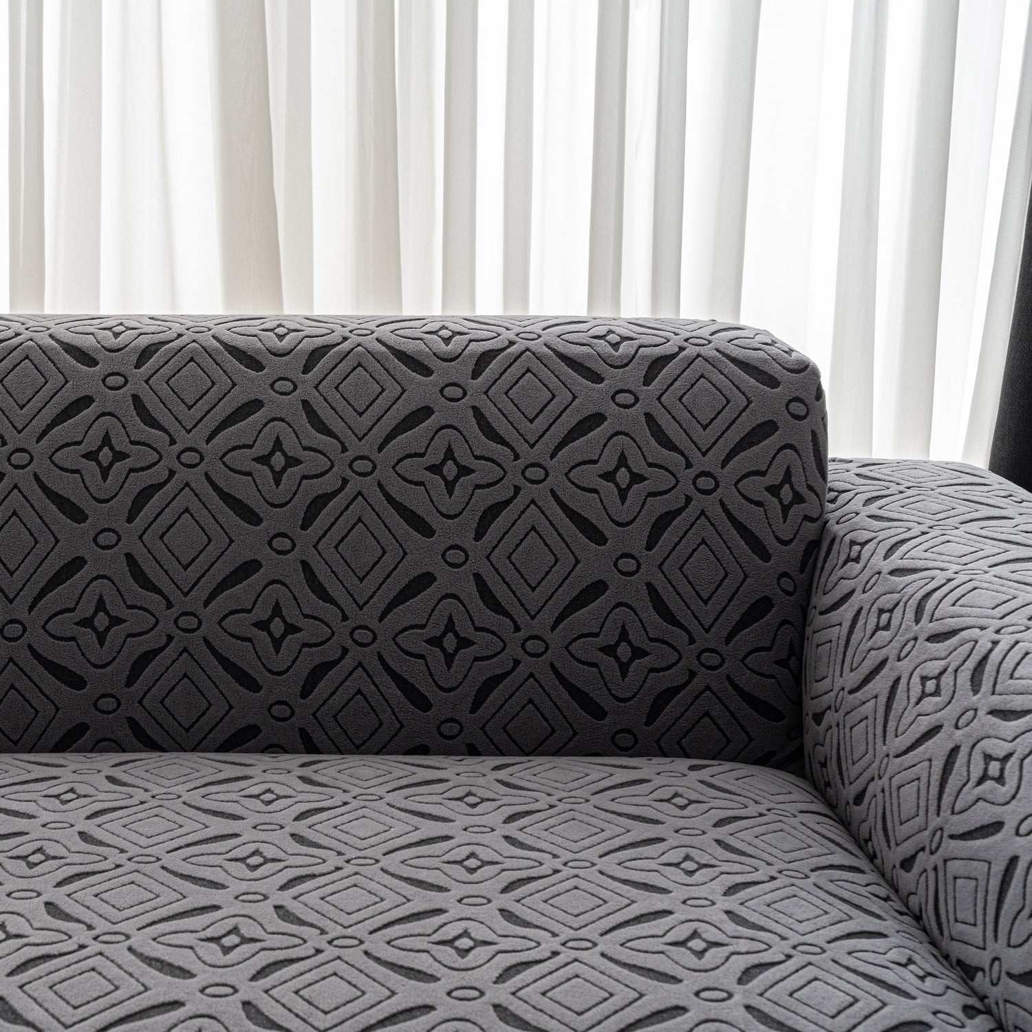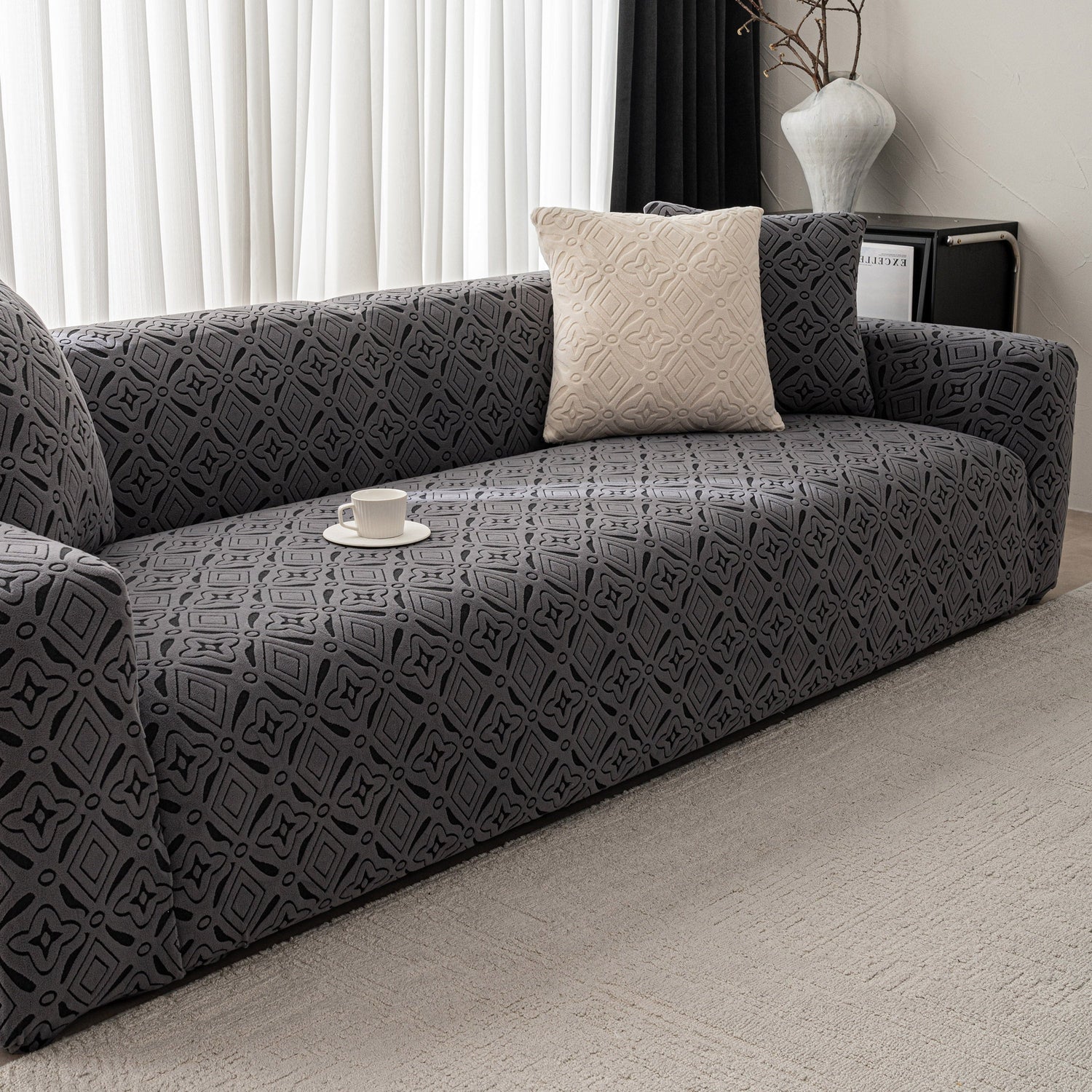 This is a one-piece sofa slipcover made from a soft, jacquard-woven polar fleece fabric. It features a two-tone geometric pattern that is woven directly into the material, giving it a distinct, textured feel. Engineered with a high-stretch fabric blend, the cover is designed to fit snugly over the contours of your couch, creating a clean, tailored appearance with minimal wrinkles. It functions as a furniture protector, offering a durable barrier against pet hair, spills, and daily wear. The cover is machine washable for easy maintenance.