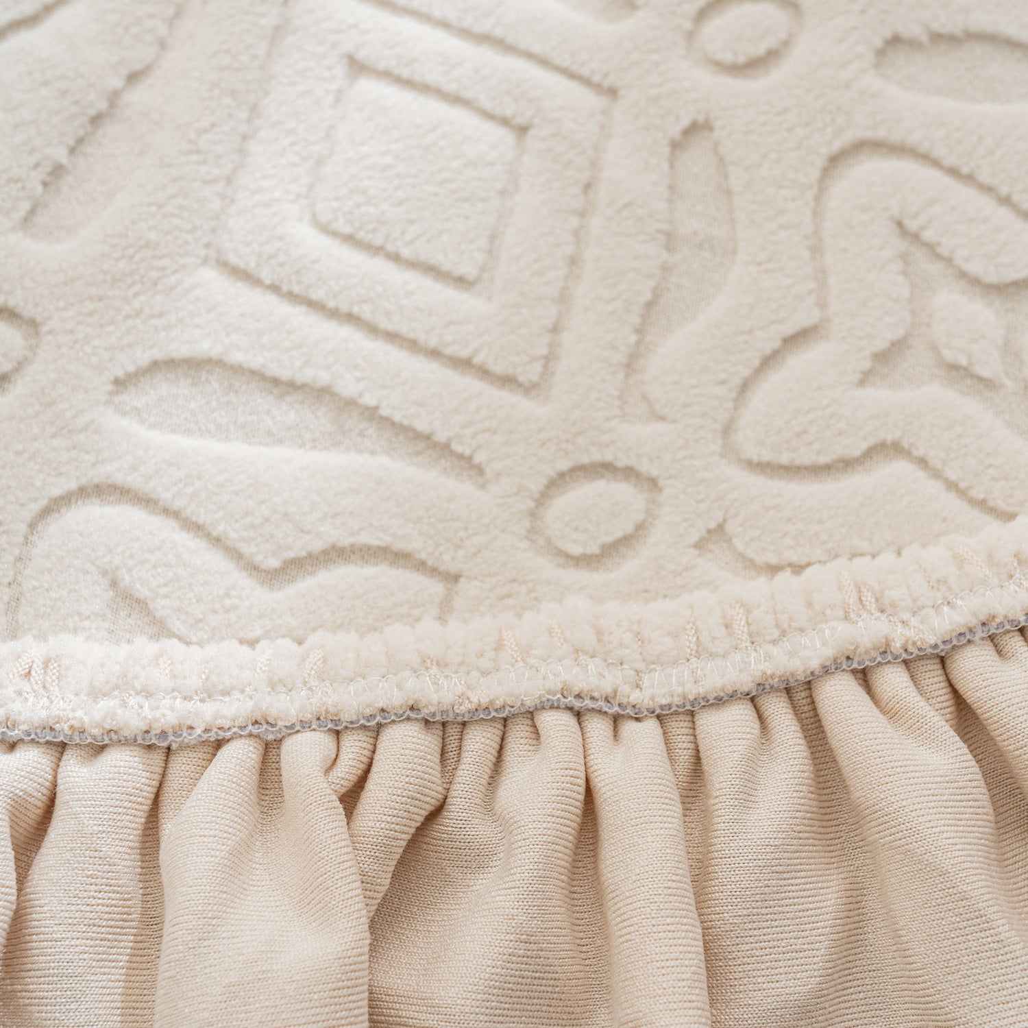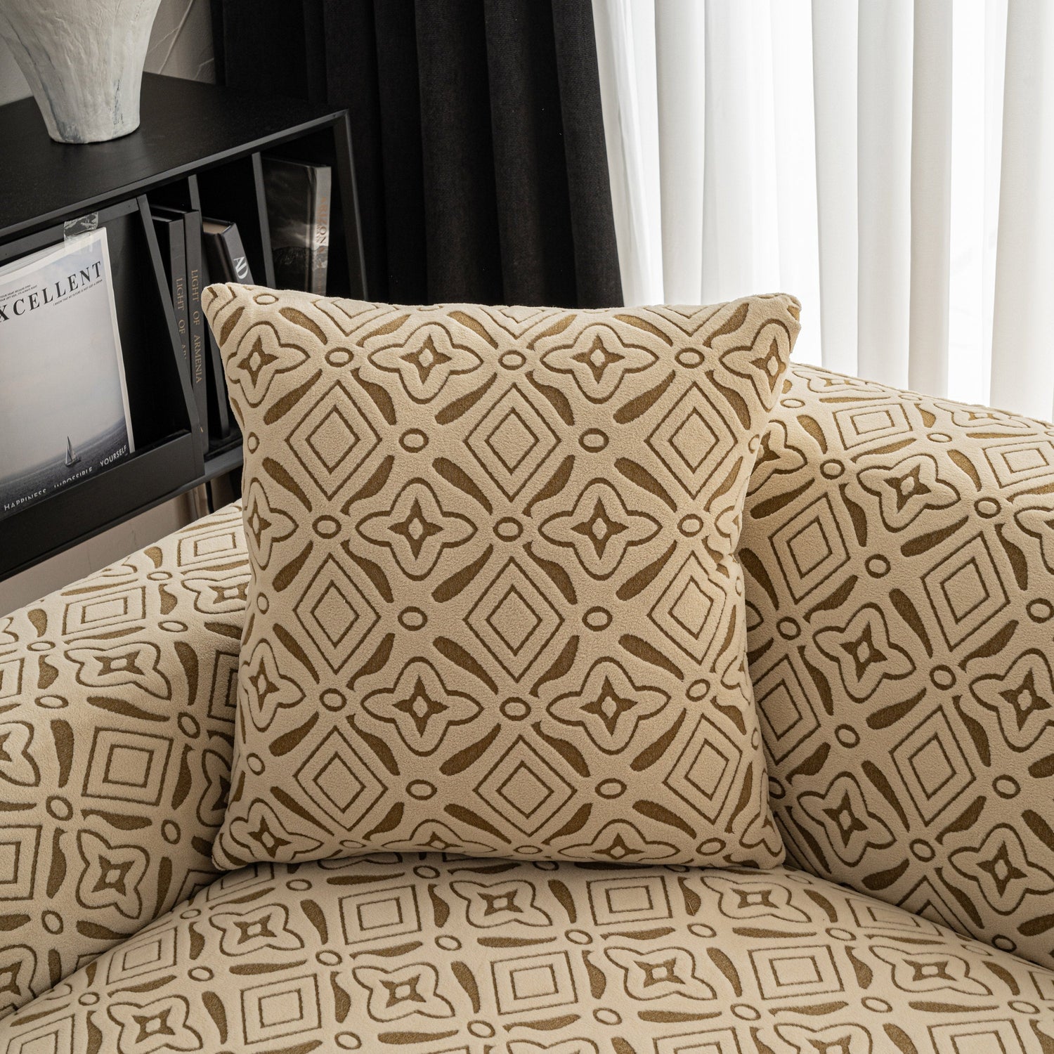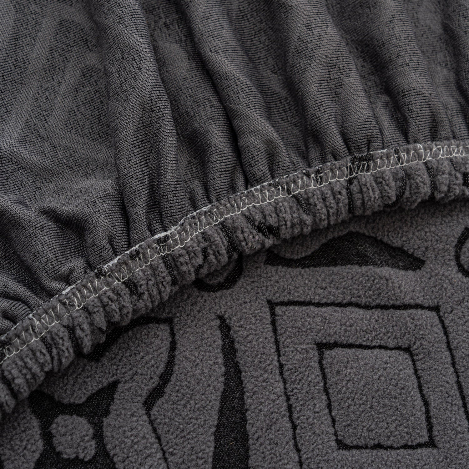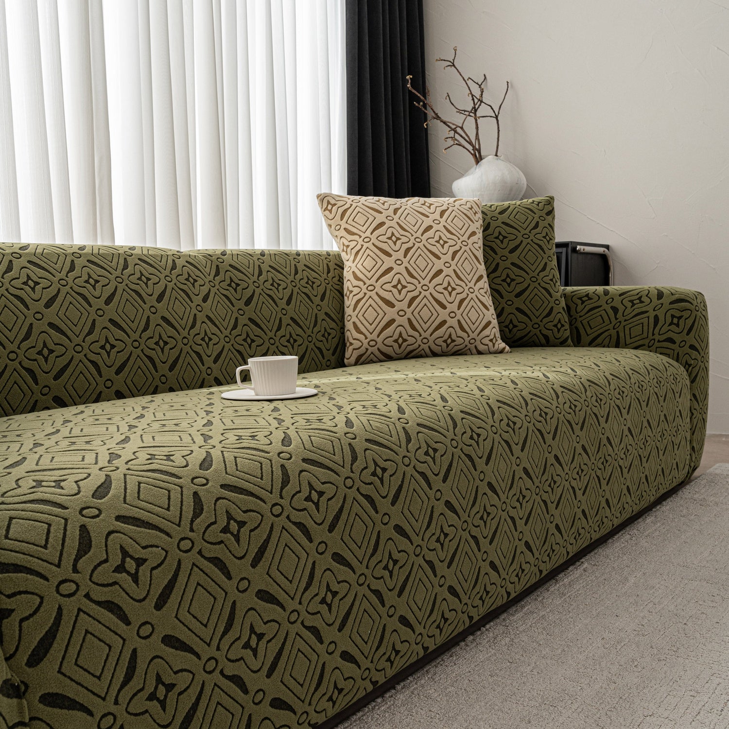 This is a one-piece sofa slipcover made from a soft, jacquard-woven polar fleece fabric. It features a two-tone geometric pattern that is woven directly into the material, giving it a distinct, textured feel. Engineered with a high-stretch fabric blend, the cover is designed to fit snugly over the contours of your couch, creating a clean, tailored appearance with minimal wrinkles. It functions as a furniture protector, offering a durable barrier against pet hair, spills, and daily wear. The cover is machine washable for easy maintenance.