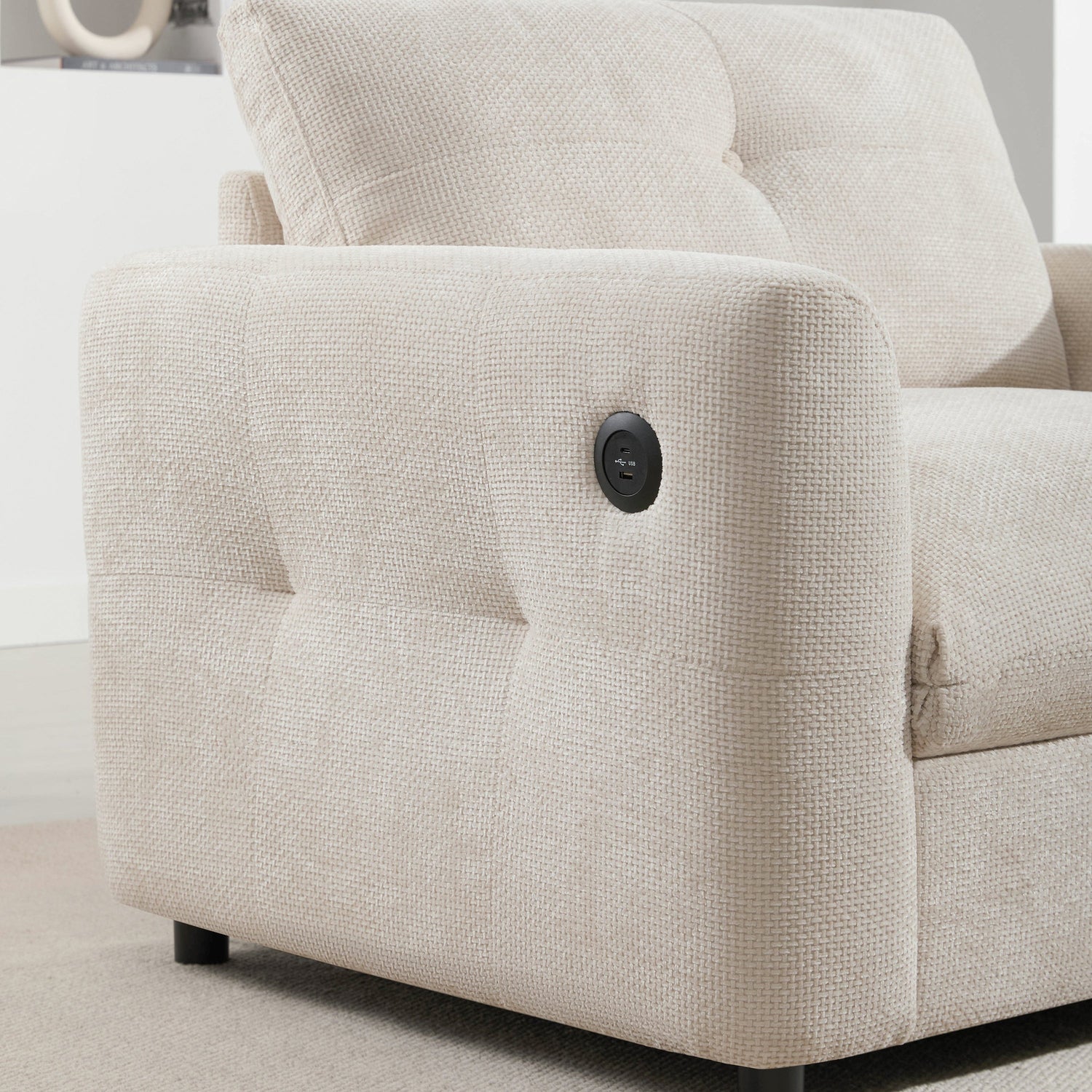Sink into unparalleled relaxation with our meticulously crafted single-seater sofa. Designed for those who cherish both luxury and practicality, this chair features elegant pulling line along the sides and hand-tufted design on the backrest. At its core, high-density, high-resilience foam fills both the seat and back cushions, delivering support that resists sagging and maintains its plush-yet-supportive feel for years. Generously scaled for ultimate comfort, the extra-wide seat and deep cushioning invite you to stretch out or curl up effortlessly, accommodating all body types with room to spare. Integrated seamlessly into the armrest, dual charging ports keep your devices powered within arm’s reach – perfect for work or leisure. Wrapped in sumptuous, durable chenille upholstery that feels luxuriously soft against the skin, this armchair blends timeless texture with modern resilience. More than just seating – it’s your personal sanctuary for reading, working, or unwinding in cloud-like comfort. Every detail engineered for indulgence.