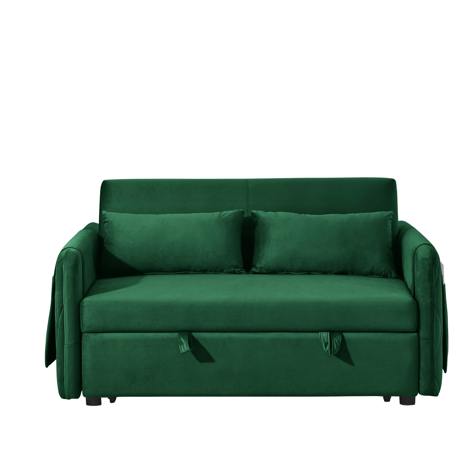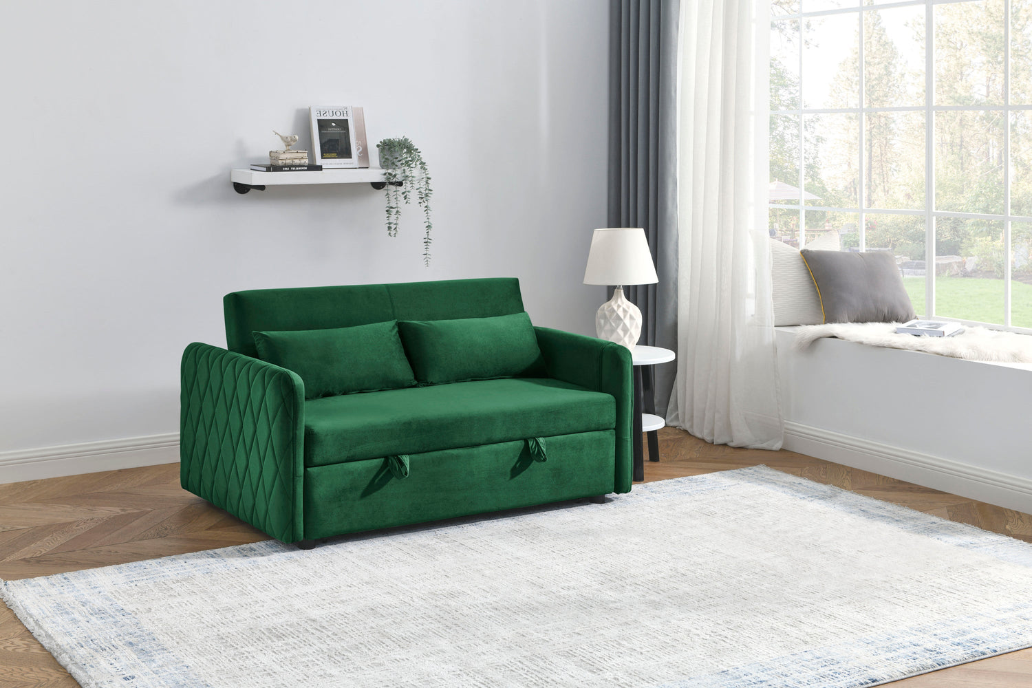 NEW 55' Modern Convertible Velvet Loveseat Sofa Bed with 2 Detachable Pockets Pull Out Bed 2 Pillows Adjustable Backrest Grid Design Armrests