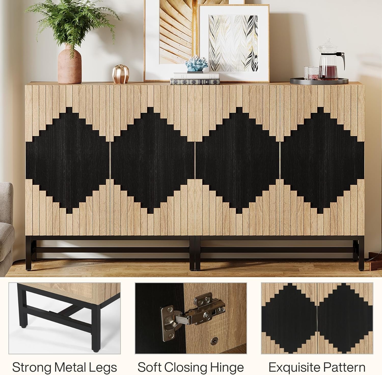 Built with a durable metal frame and engineered wood, this sideboard is designed for everyday use. An anti-tip device adds safety for busy homes, while hidden hardware and a two-tone geometric door pattern deliver a clean, contemporary look that ages well.