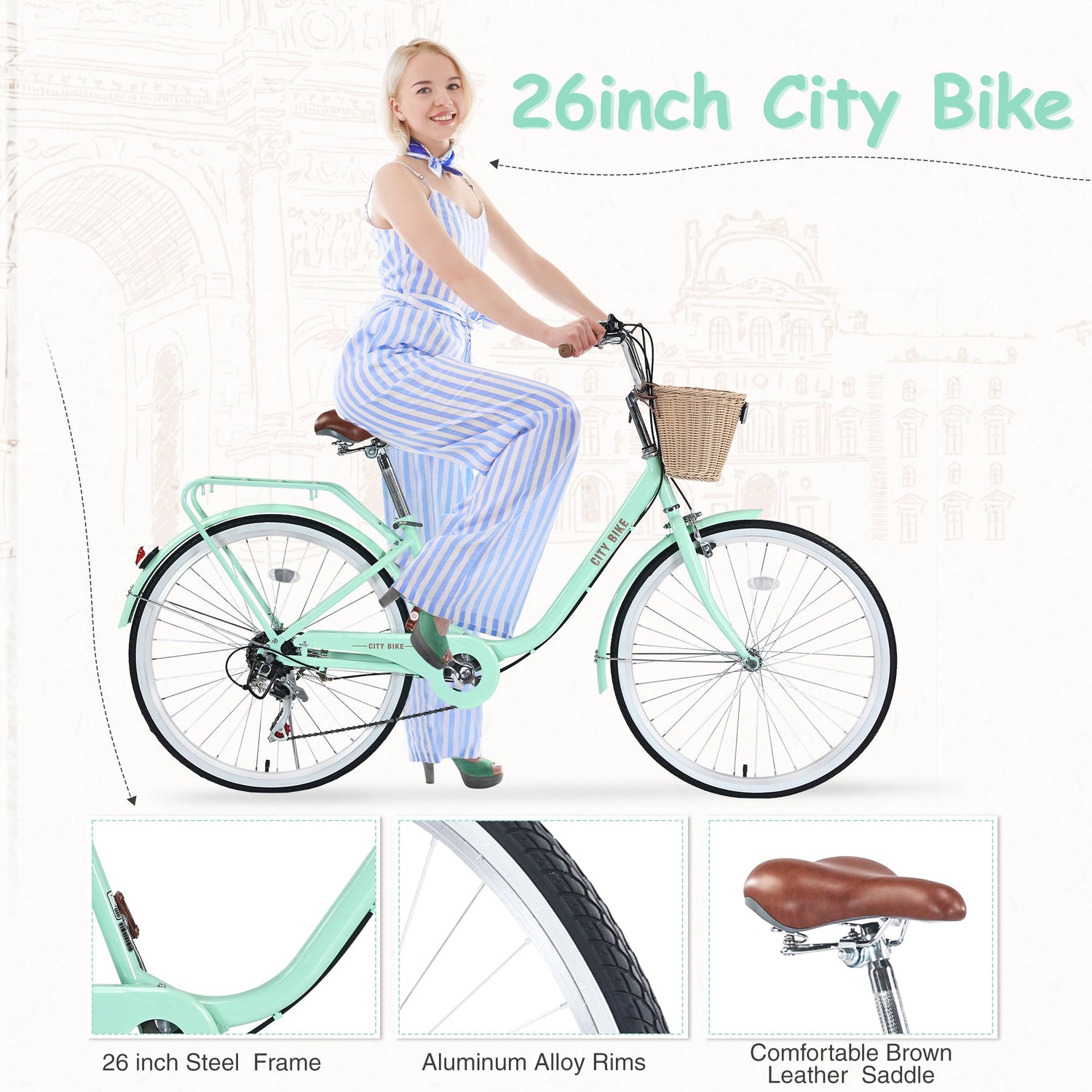 NEW 7 Speed City Bike With Basket , Steel Frame,Multiple Colors 26 Inch Girls Bicycle