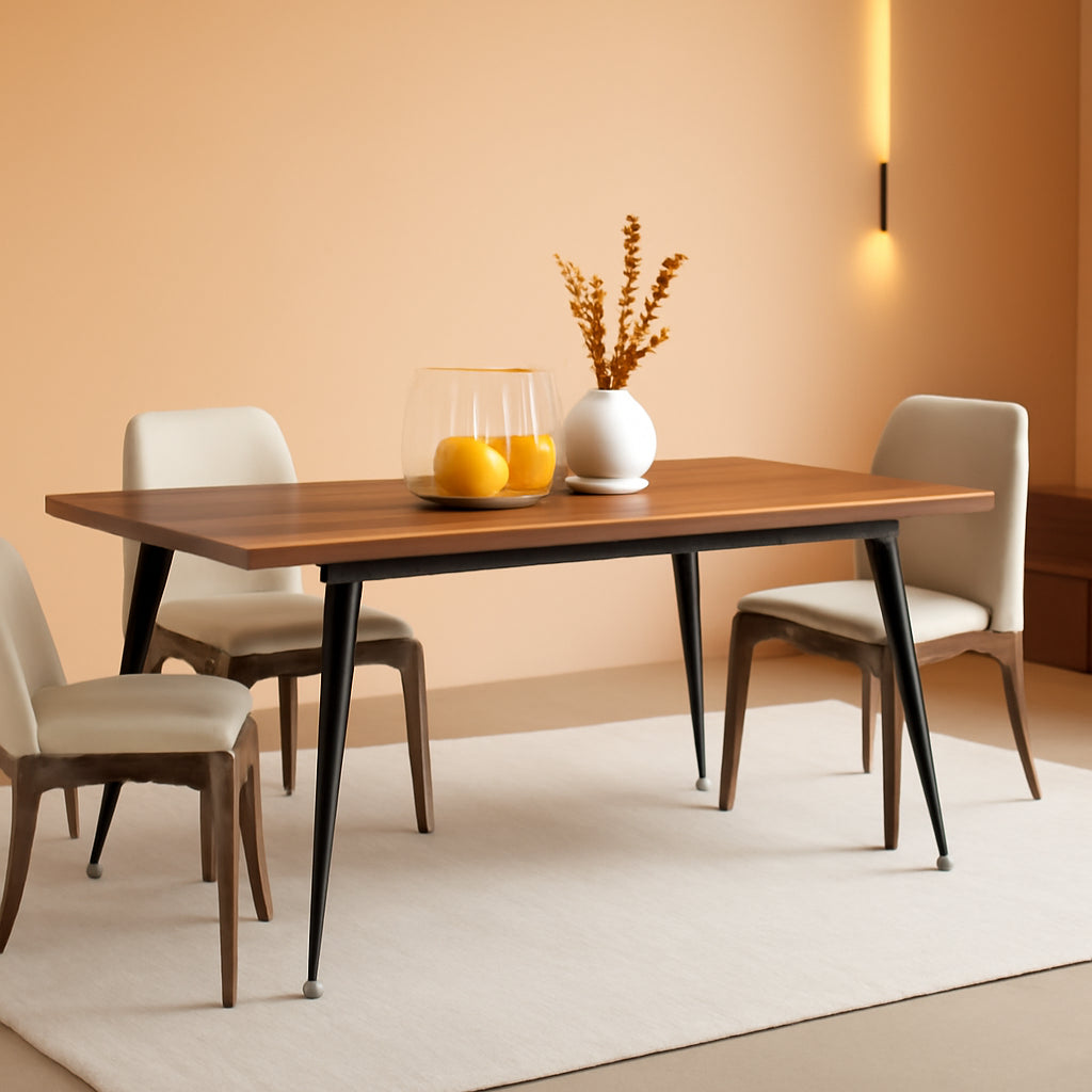 Crafted for longevity, this modern dining table blends a waterproof, anti-scratch MDF tabletop with rugged black metal legs. Its minimalist silhouette, rounded safety corners, and tapered legs deliver urban sophistication that fits modern, industrial, and rustic interiors.