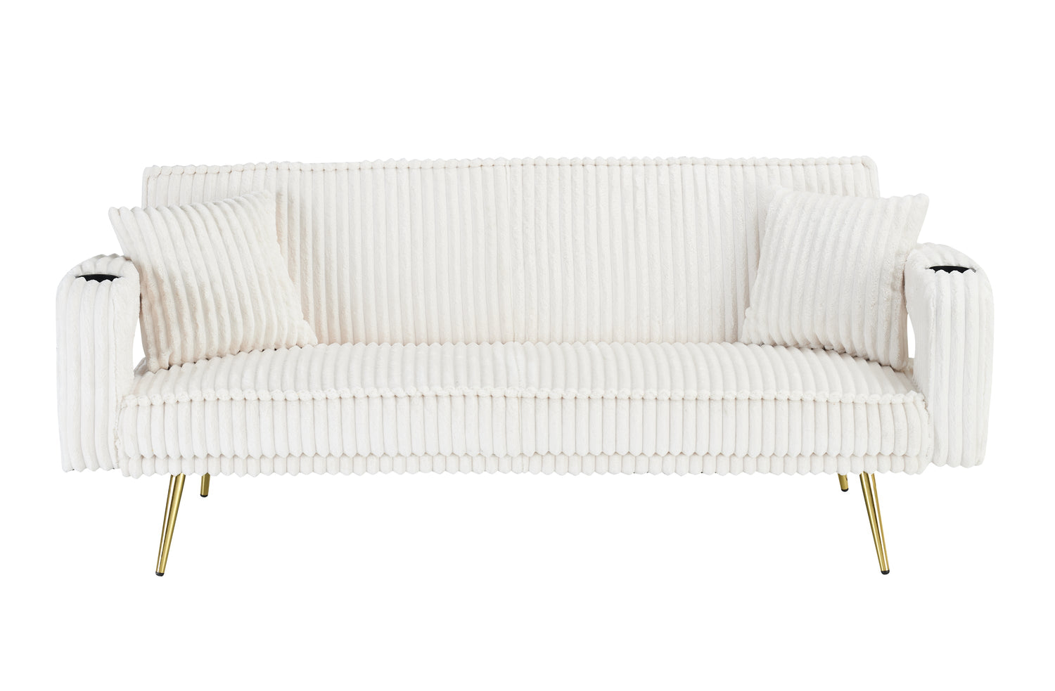 The pure white corduroy fabric has a low-key yet luxurious velvet texture that reflects a soft and elegant luster as the light changes. The sofa has cup holders on both sides of the armrests, so you no longer need to worry about where to place your drinks; just lift your hand and place the cup securely. The backrest has three adjustable positions: the first position allows you to lean back slightly, stretching your spine; the second position increases the angle, allowing you to sink deeper into the sofa, perfect for a lazy afternoon nap; the third position reclines all the way, instantly turning the sofa into a flat, soft bed. When you're tired or sleepy, you can lie down comfortably and stretch out. From daily relaxation to temporary rest, this sofa meets all your needs, supporting every bit of your laziness and relaxation. It's not just a piece of furniture, but a gentle remedy for a tired life.