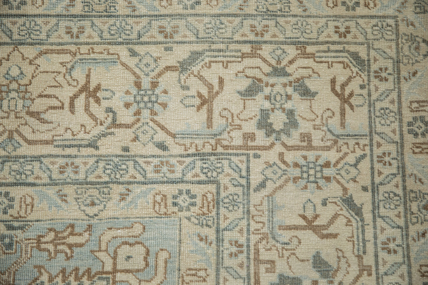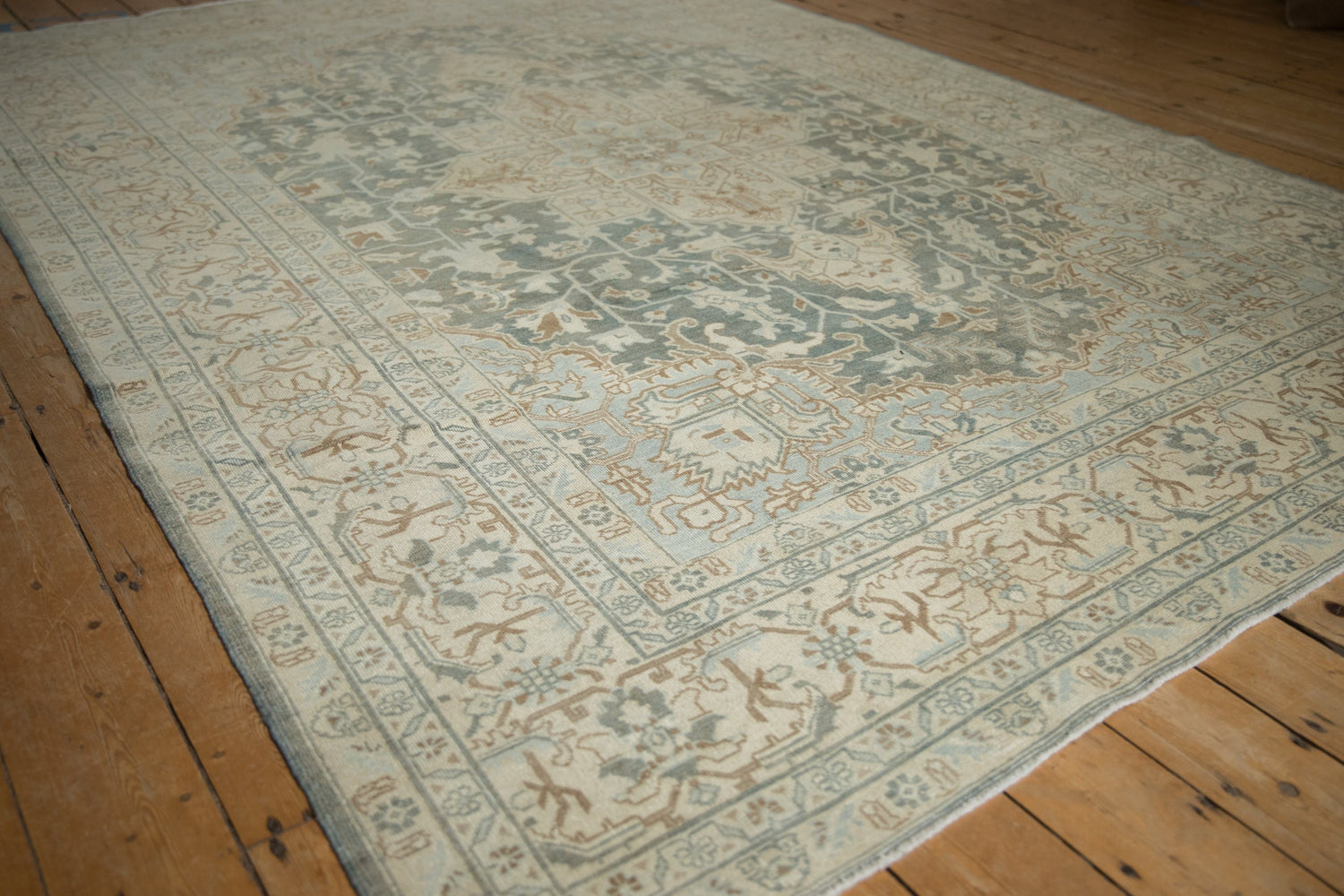 :: Oversize center medallion adorned by arrowed finials atop a covered field in a Heriz-like rendering of sprawling geometric vines with scrolled blossoms and leaves. Main border in a partial Herati design motif. Colors and shades include: Pale dusty teal, cream, ivory, pale coffee brown, beige, sand, slate blue, and more. Condition notes: Even wear across to knot heads with faint foundation showing through. Most of the original side cord selvages are intact or restored. Fully secured sides and ends. Recently professionally cleaned ready for in-home use! Many years of enjoyment to come with this hand knotted Persian Tabriz carpet made in Persia circa 1950's vintage. Size measures 7'3" x 10'3".