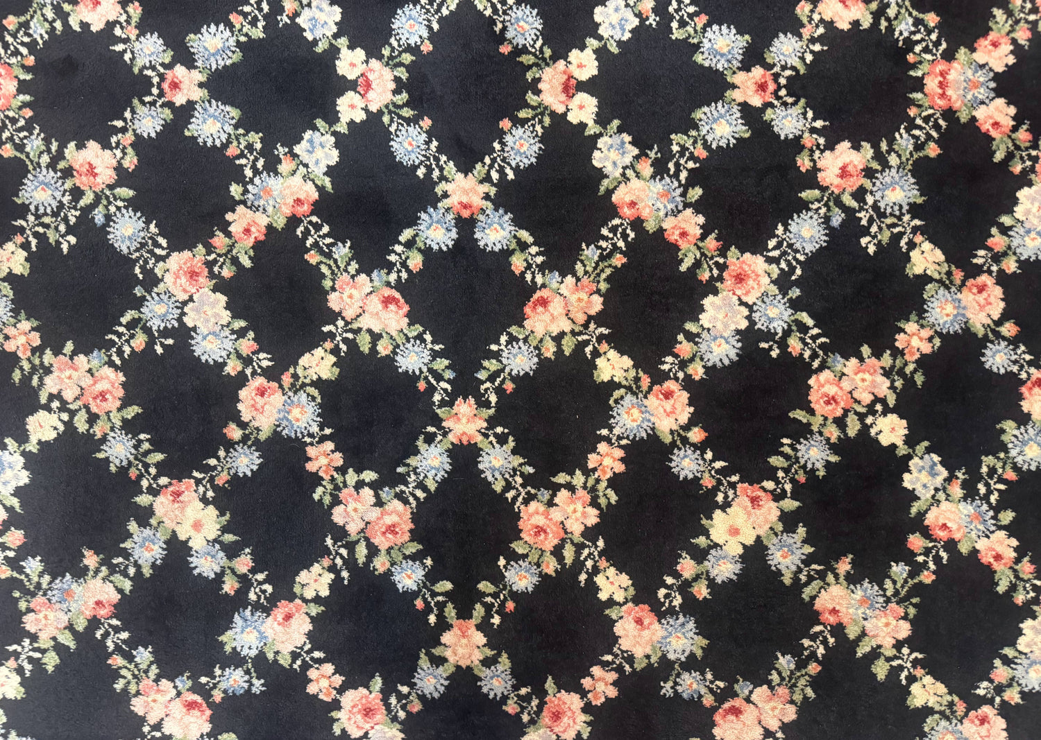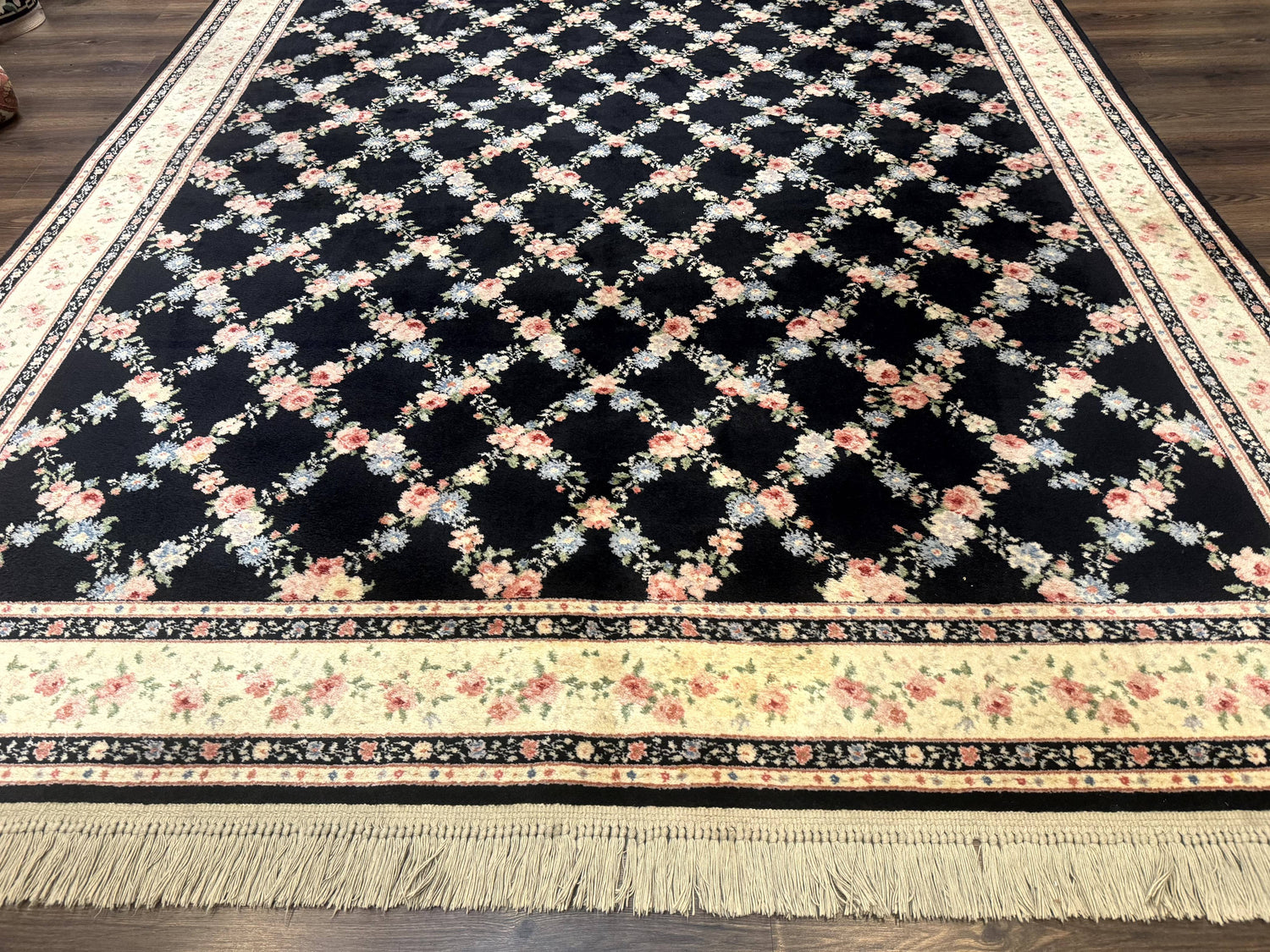 USED 8.8 x 12 Karastan Garden of Eden Rug, Ebony Trellis #509/1270, Black, Floral, Wool Pile, Vintage, Discontinued