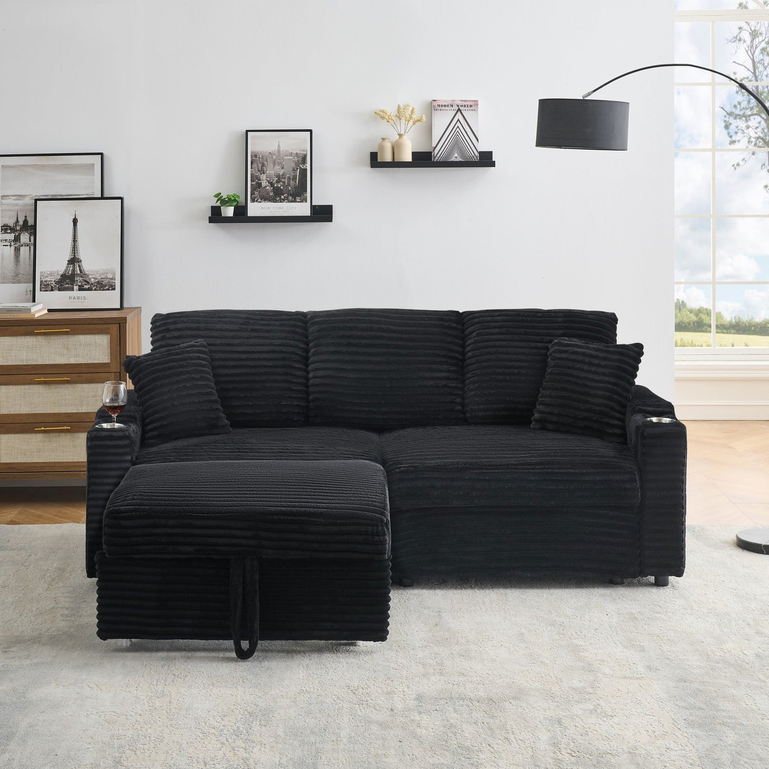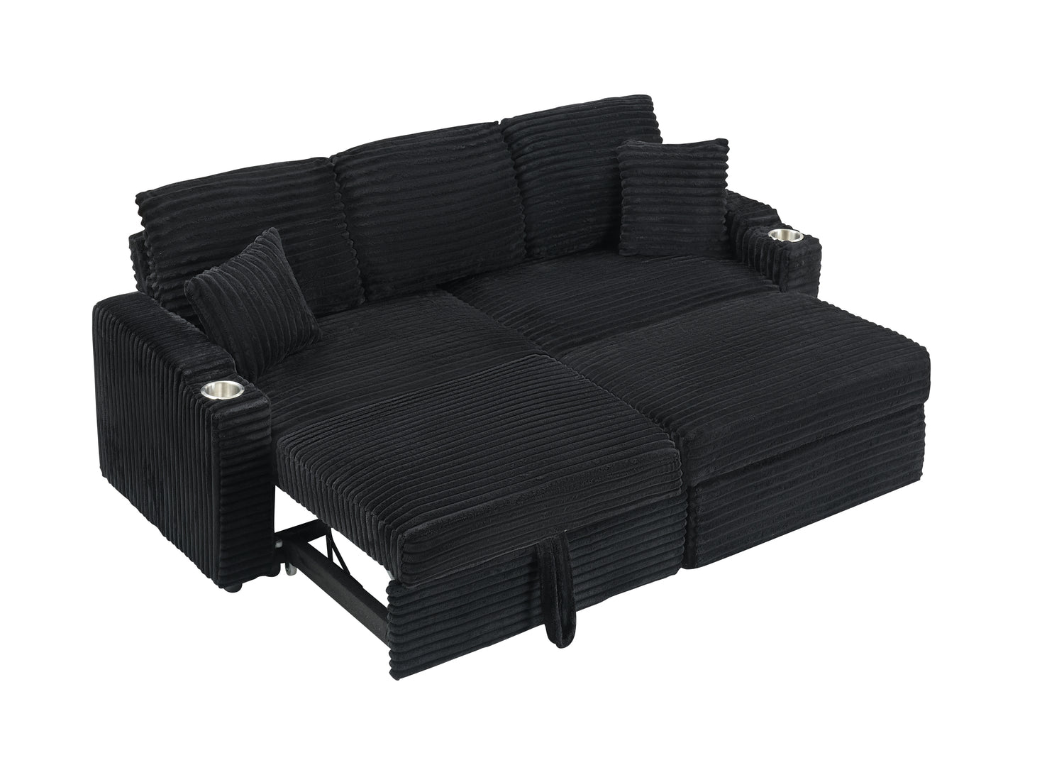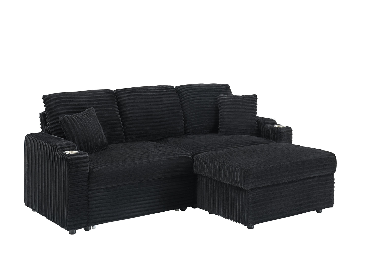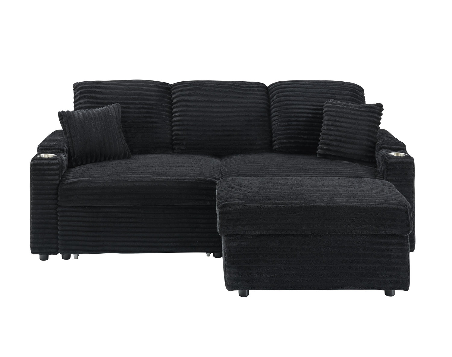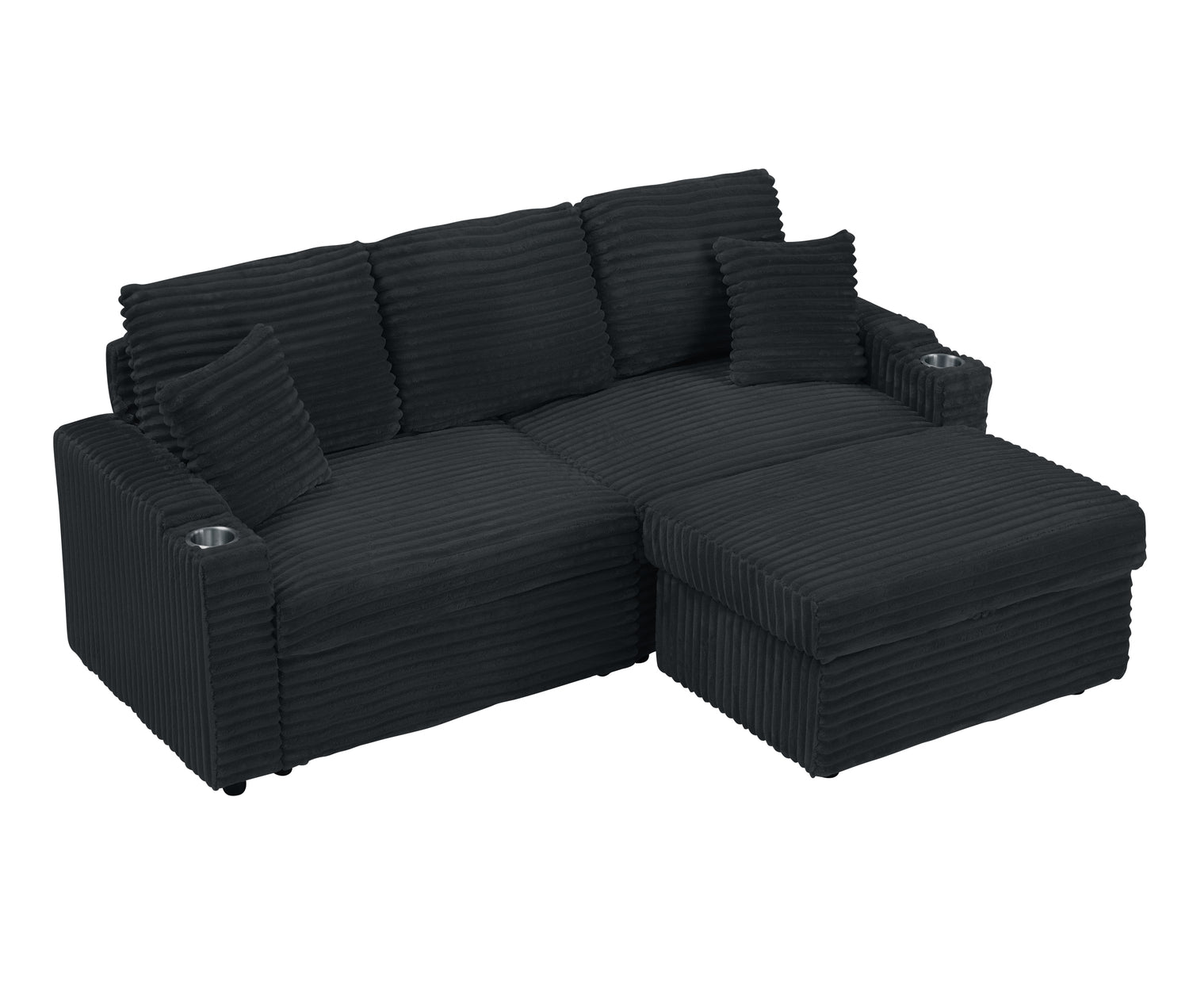 NEW 80' Corduroy Multi-Function Sofa with Hidden Reclining, Space Saving Design, Armrests, Cup Holders and Removable Footstool, Black