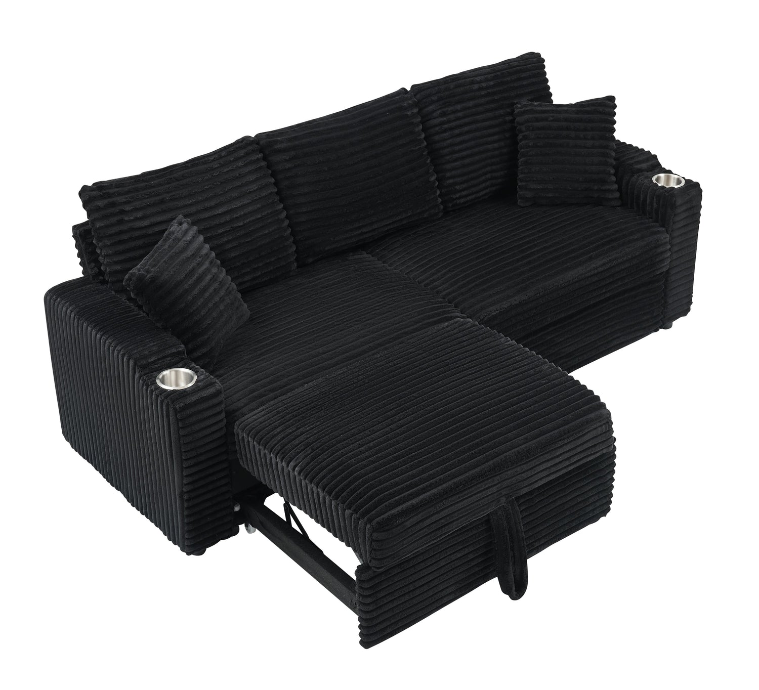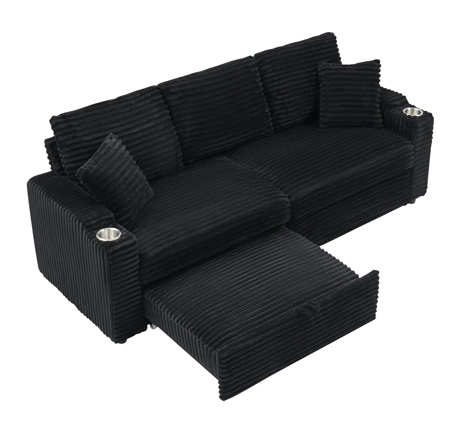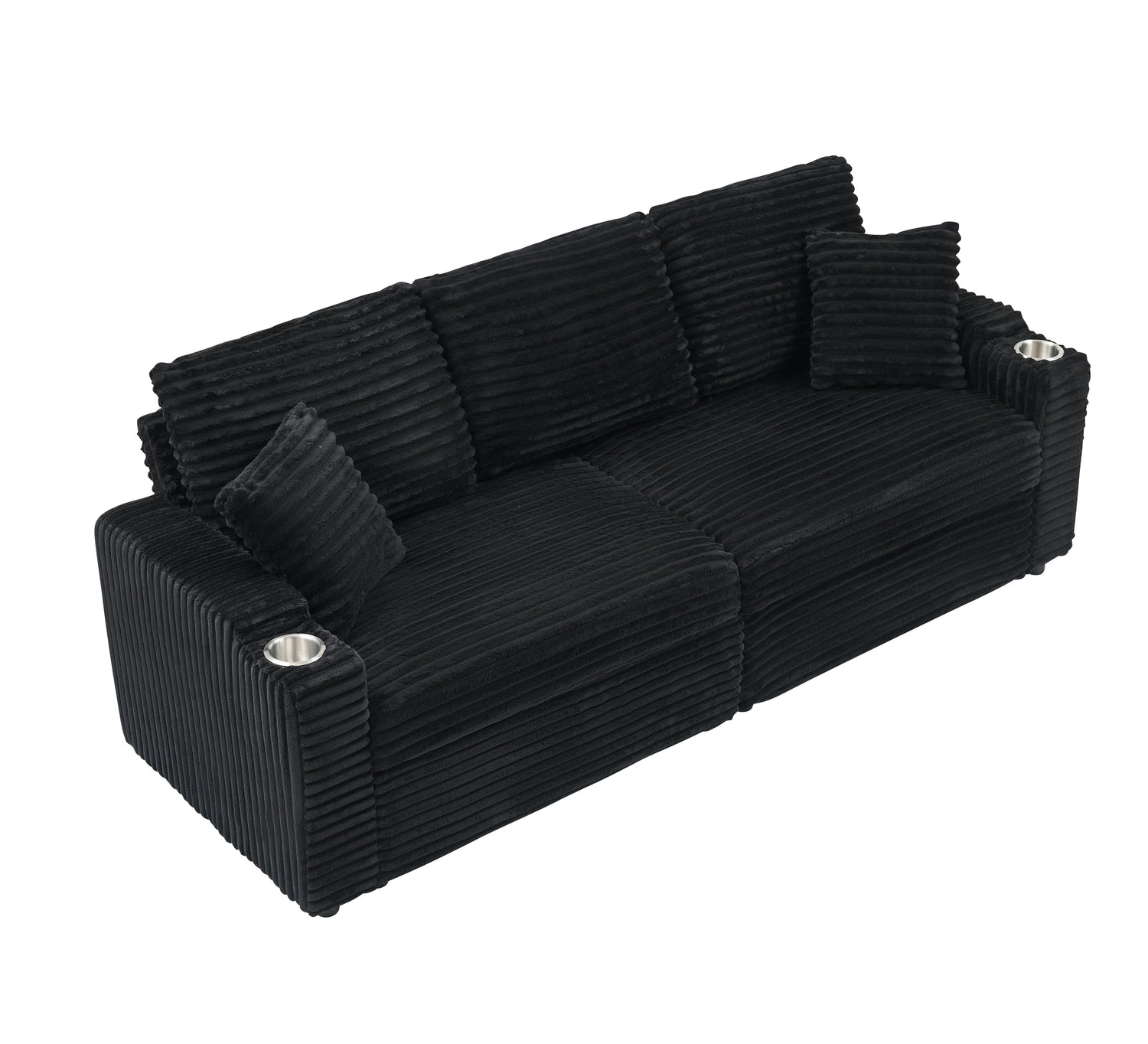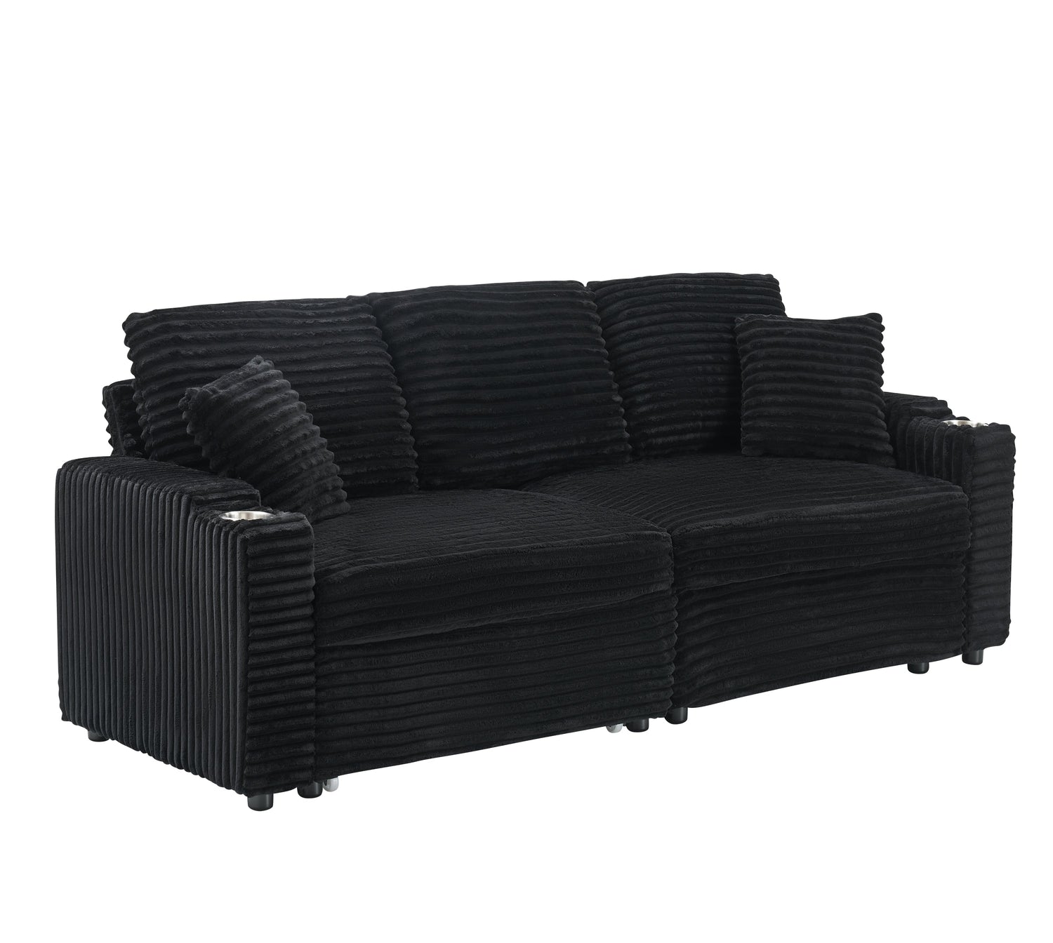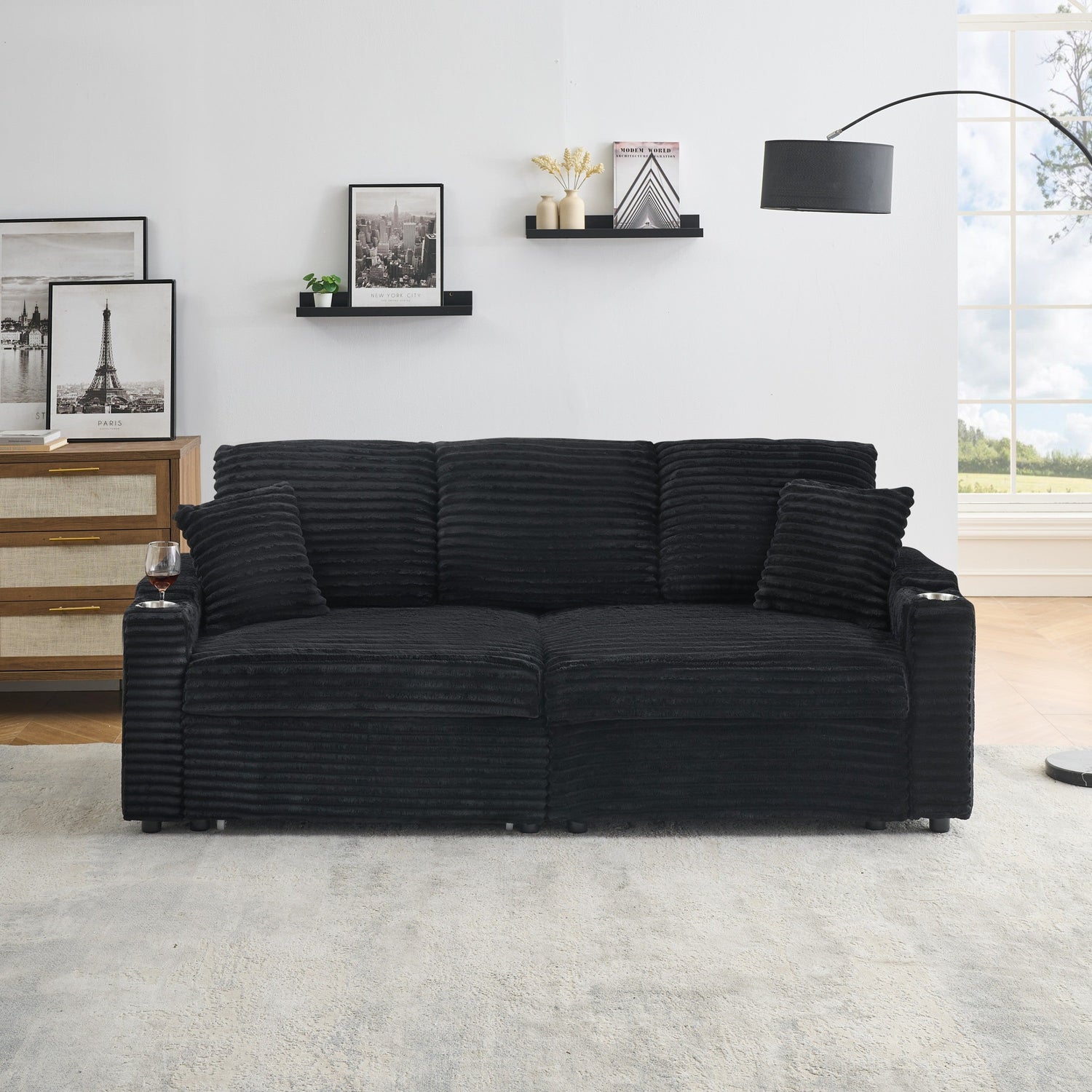 NEW 80-inch 2-in-1 Folding Black Corduroy fabric Sofa equipped with Cup Holder and Pillow