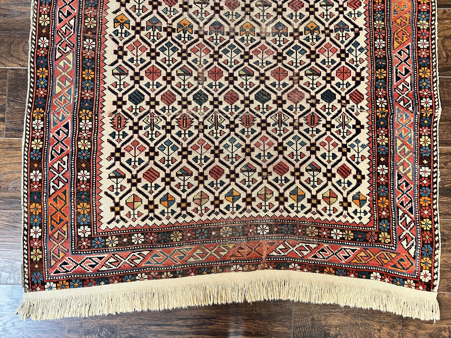 | Condition/Notes | A beautiful antique Caucasian rug in very good condition considering age. Free of stains, odors, discolorations, tears, etc. Good pile; some areas of low pile, as to be expected with age. New fringes added. Recently cleaned and ready to be enjoyed in your space. |
