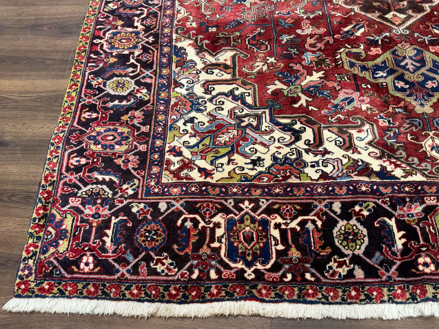 This antique Persian Heriz rug measures approximately 8x11 and features a commanding central medallion set against a saturated brick red field. Intricately stepped ivory corners contrast sharply with the darker field, while stylized palmettes and angular vine scrolls accent the surrounding design. The rug’s bold geometric structure is enhanced by deep midnight blues and hints of green in the border, creating a dramatic tribal aesthetic. Woven in the 1940s, it retains excellent wool quality and strong visual presence—ideal for anchoring a living or dining space.