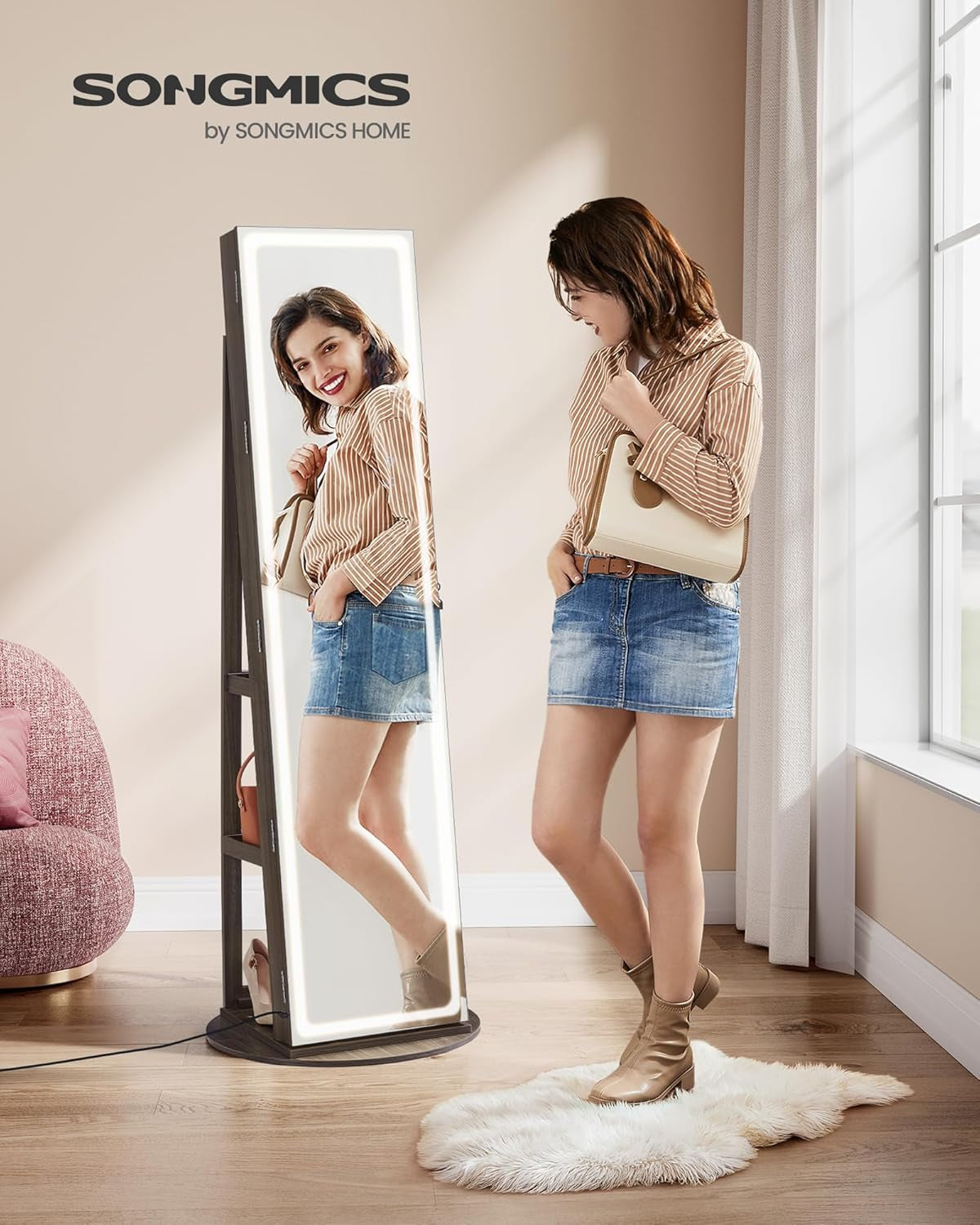 - Full-length mirror with adjustable LED lights — three light shades and touch control to find the ideal lighting for makeup, styling, and dressing.