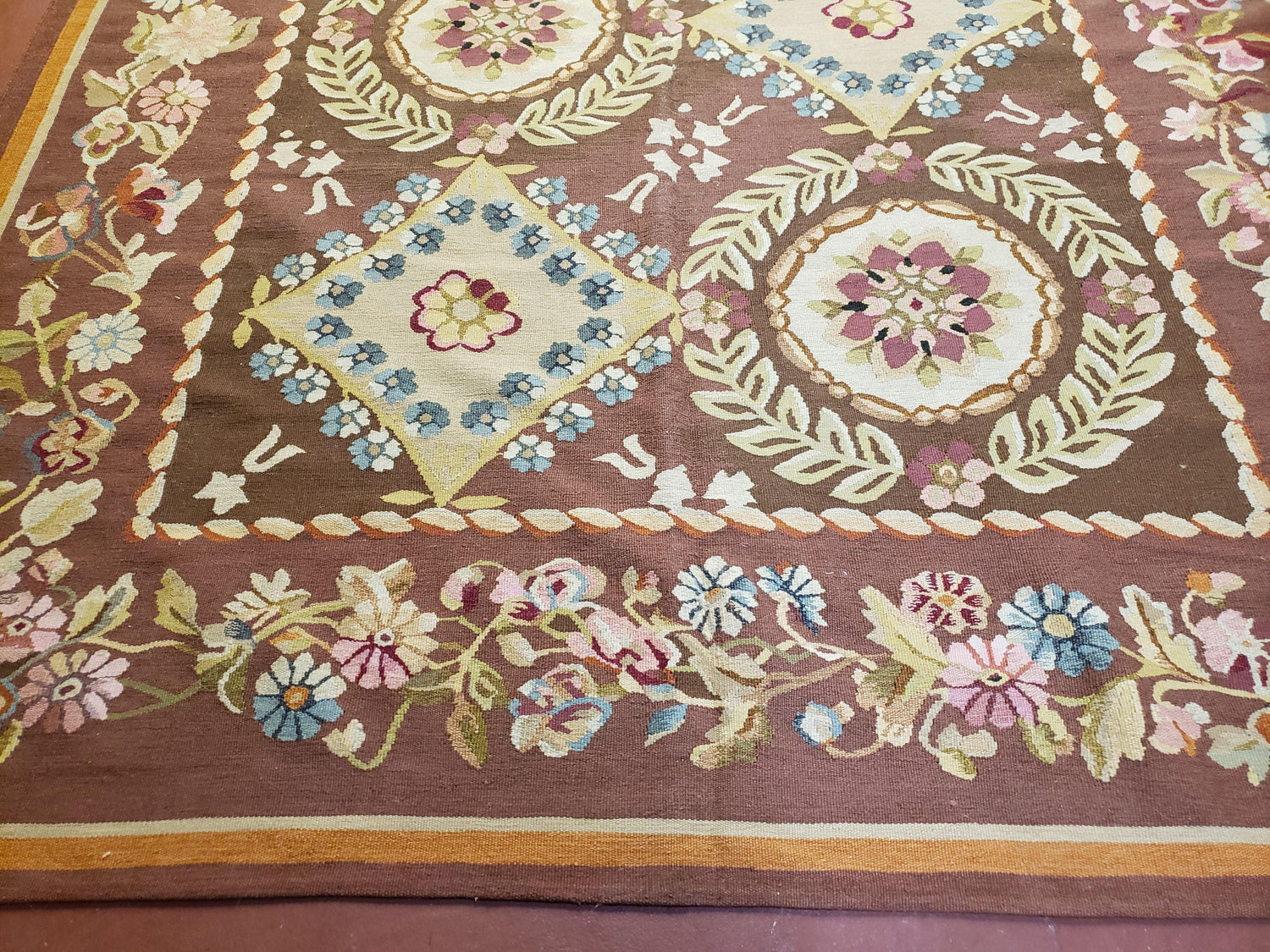 USED Aubusson Rug 6 x 9 Flat Weave Area Carpet European Design Flowers New Brown Rug Handmade Wool Hand-Knotted Aubusson Weave Medium Rug 6x9