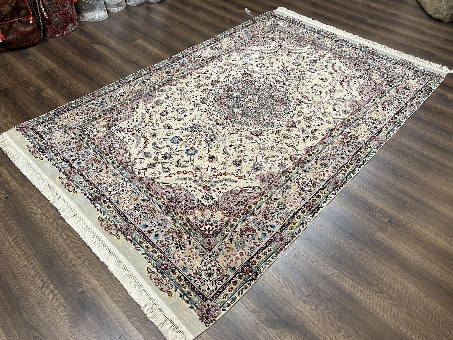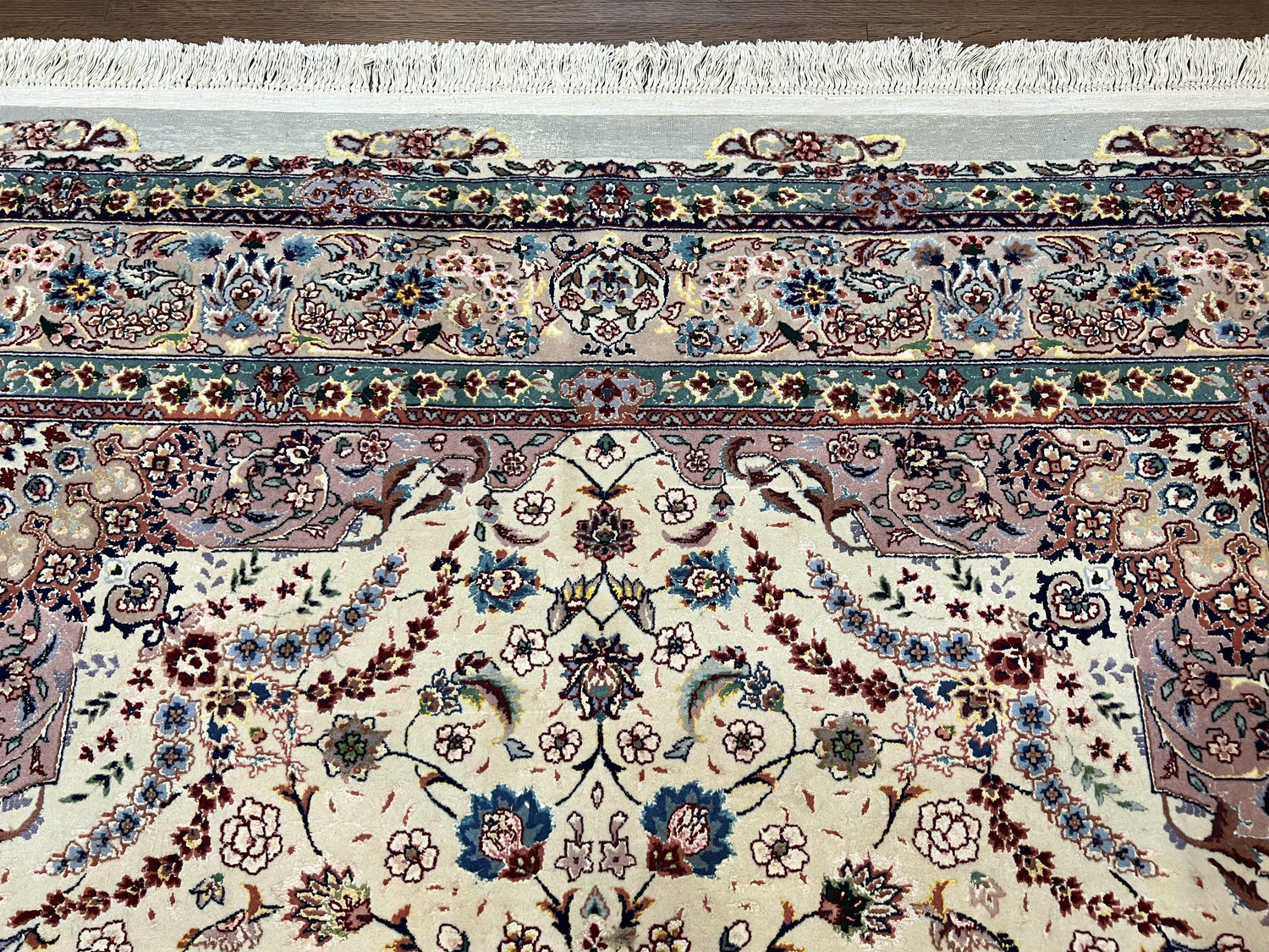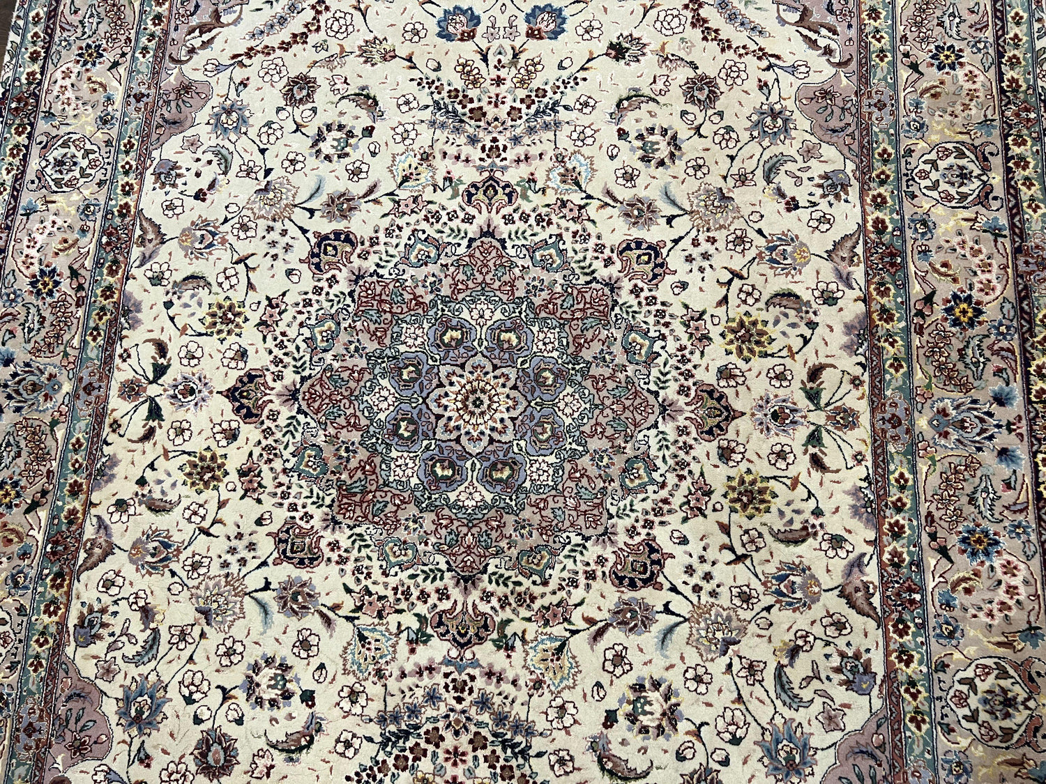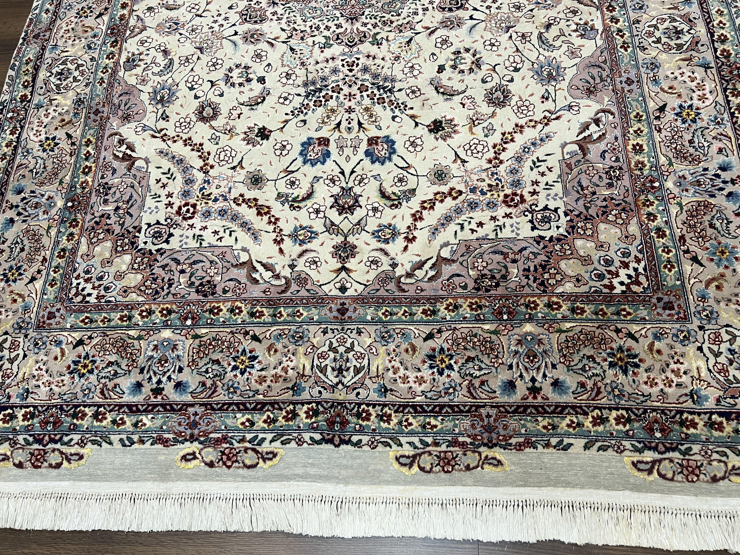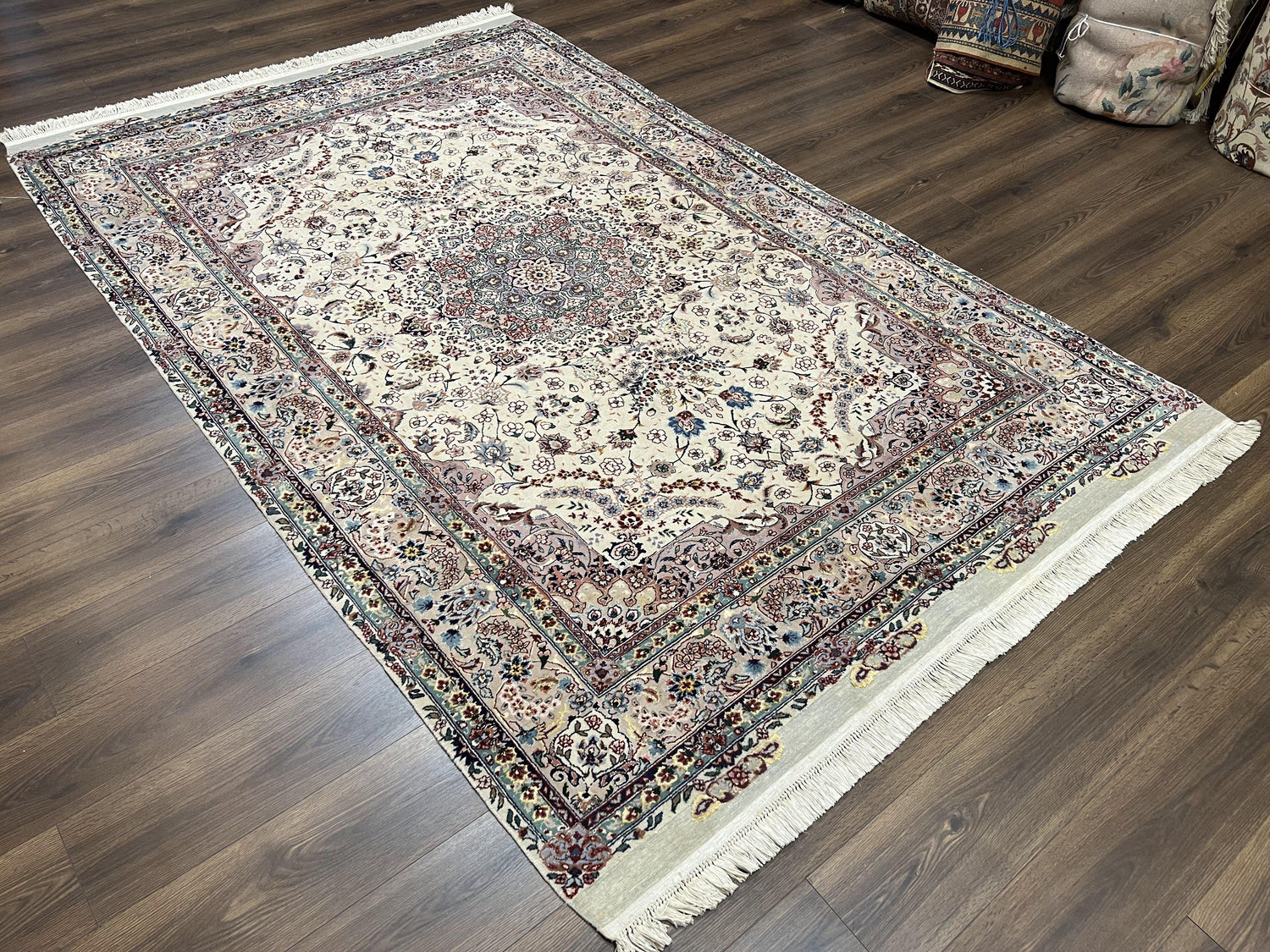 USED Beautiful Pak Persian Rug 6x9, Floral Medallion, Wool and Silk, Highly Detailed Elegant Carpet, Vintage Oriental Rug 6 x 9, Cream and Gray