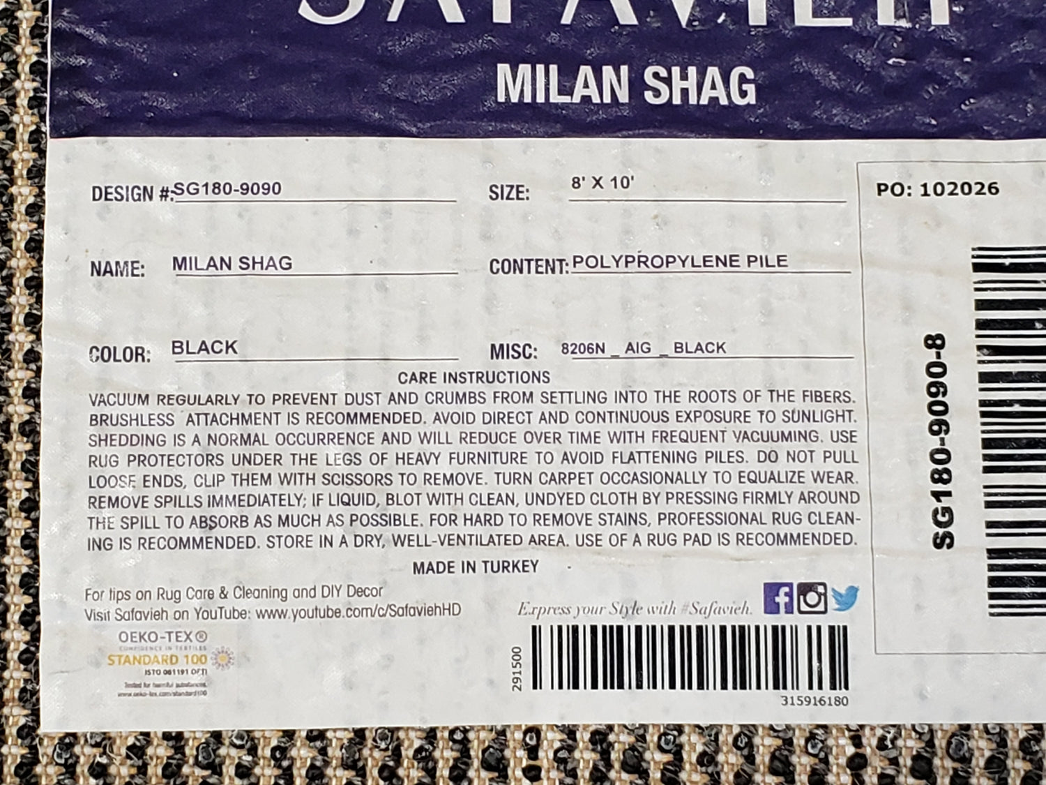 | Condition/Notes | Designed with an eye toward contemporary style, ease of care, and plush comfort, Safavieh's Milan Shag Collection creates a relaxed atmosphere. Ultra-soft polypropylene fibers are used for this premium collection of multi-level power-loomed shag rugs. A delightful 2-inch pile thickness adds warmth and flowing dimension to any room. In great condition |
