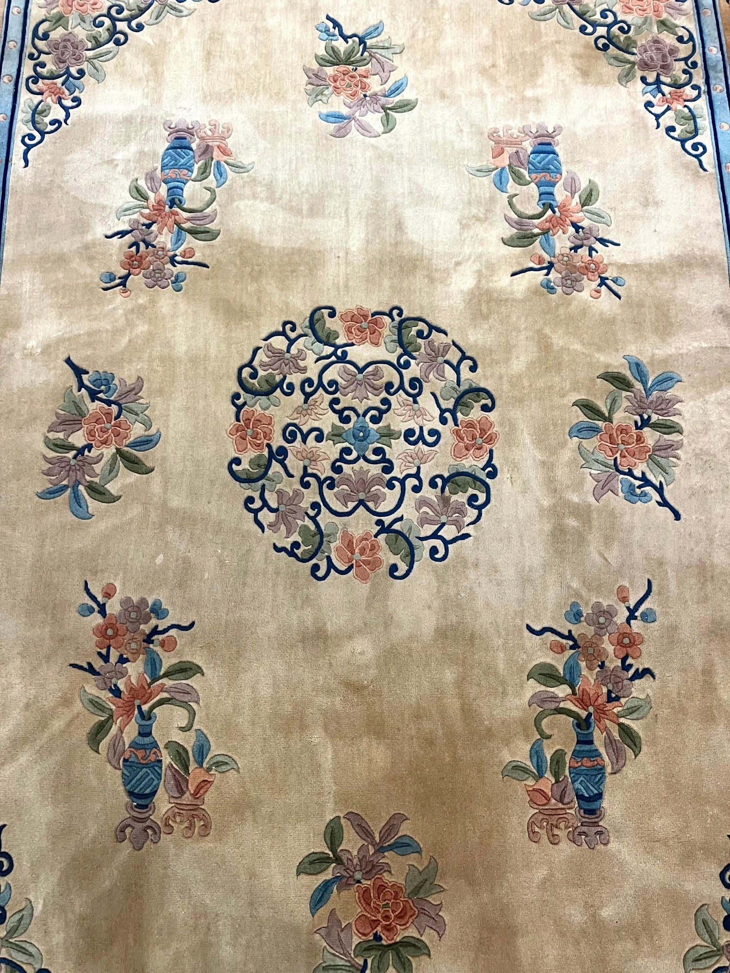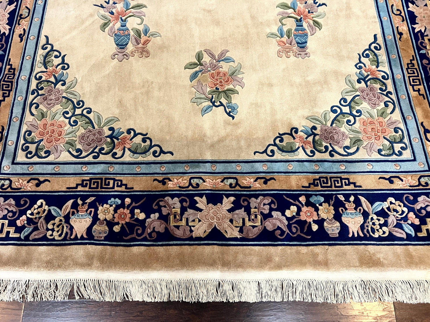 USED Chinese Wool Rug 8x11, Peking Asian Oriental Carpet, Cream/Ivory and Blue, Vintage Handmade Rug, Art Deco Rug