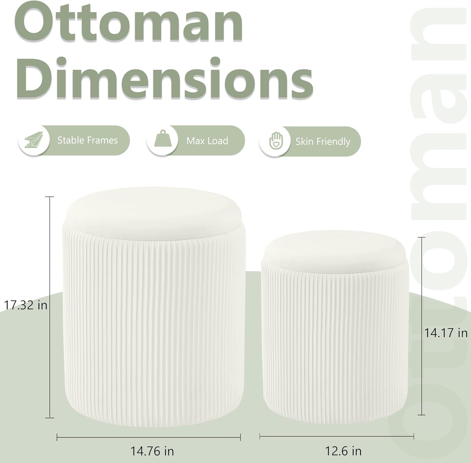 Double the style, double the storage with the Compact Round Velvet Storage Ottoman Two-Pack in White. This set includes a larger ottoman (14.76" x 14.76" x 17.32") and a smaller one (12.6" x 12.6" x 14.17"), designed to stack neatly to save valuable floor space.