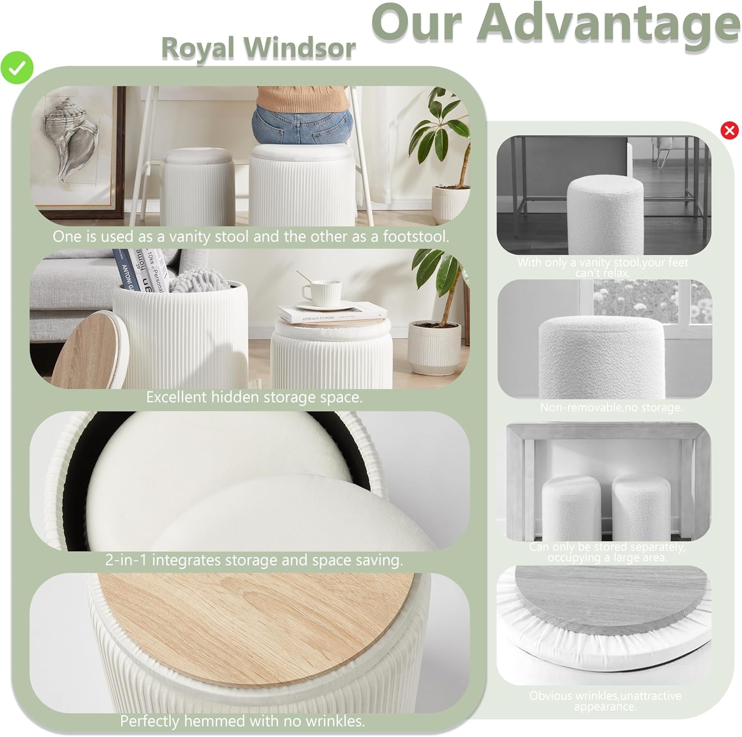 - Versatile seating and surface: Use as a footrest, shoe bench, or vanity stool. Each ottoman features a reversible top that doubles as a small side table for coffee, books, and more.