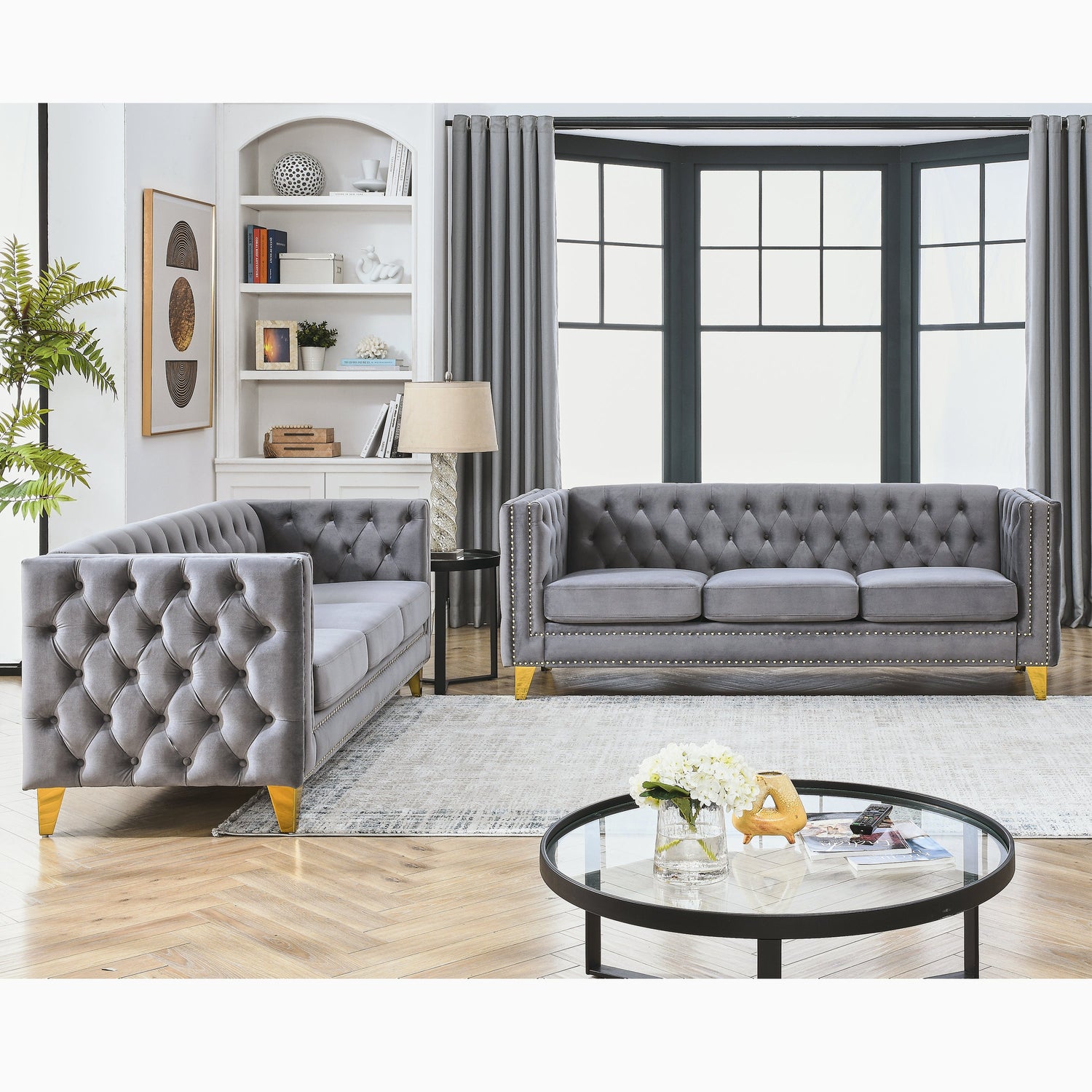 NEW Velvet Sofa for Living Room, Buttons Tufted Square Arm Couch, Modern Couch Upholstered Button and Metal Legs, Sofa Couch for Bedroom, Grey Velvet .2PCS