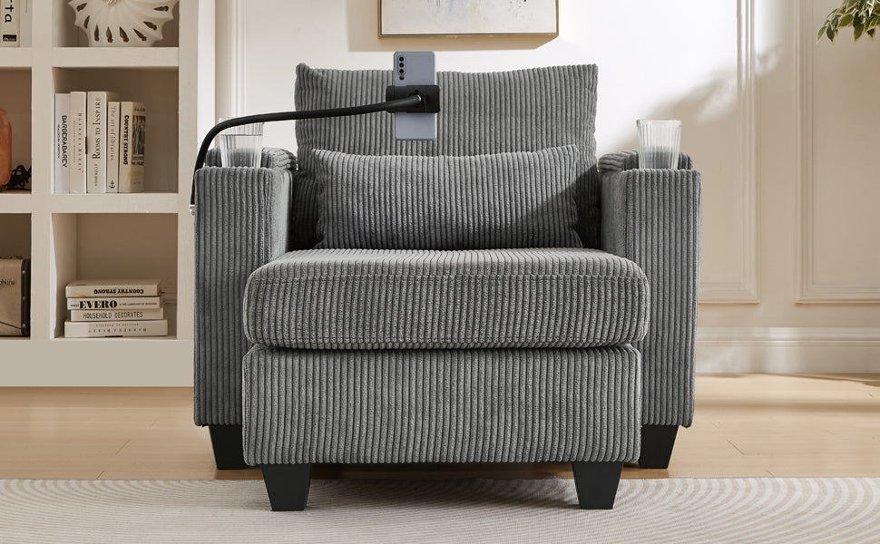 This versatile convertible sofa combines comfort, functionality, and smart space-saving features, making it ideal for modern, compact living. Its dual-mode design allows it to easily switch between a cozy chaise lounge and a functional sofa chair, offering flexibility for different seating needs. Thoughtfully designed armrests include hidden storage compartments and cup holders, while built-in USB charging ports and a flexible phone holder enhance modern convenience. Upholstered in soft, durable corduroy fabric, the sofa also comes with a supportive lumbar pillow for added comfort. Side storage pockets complete the design, providing accessible organization and reducing clutter in smaller spaces.