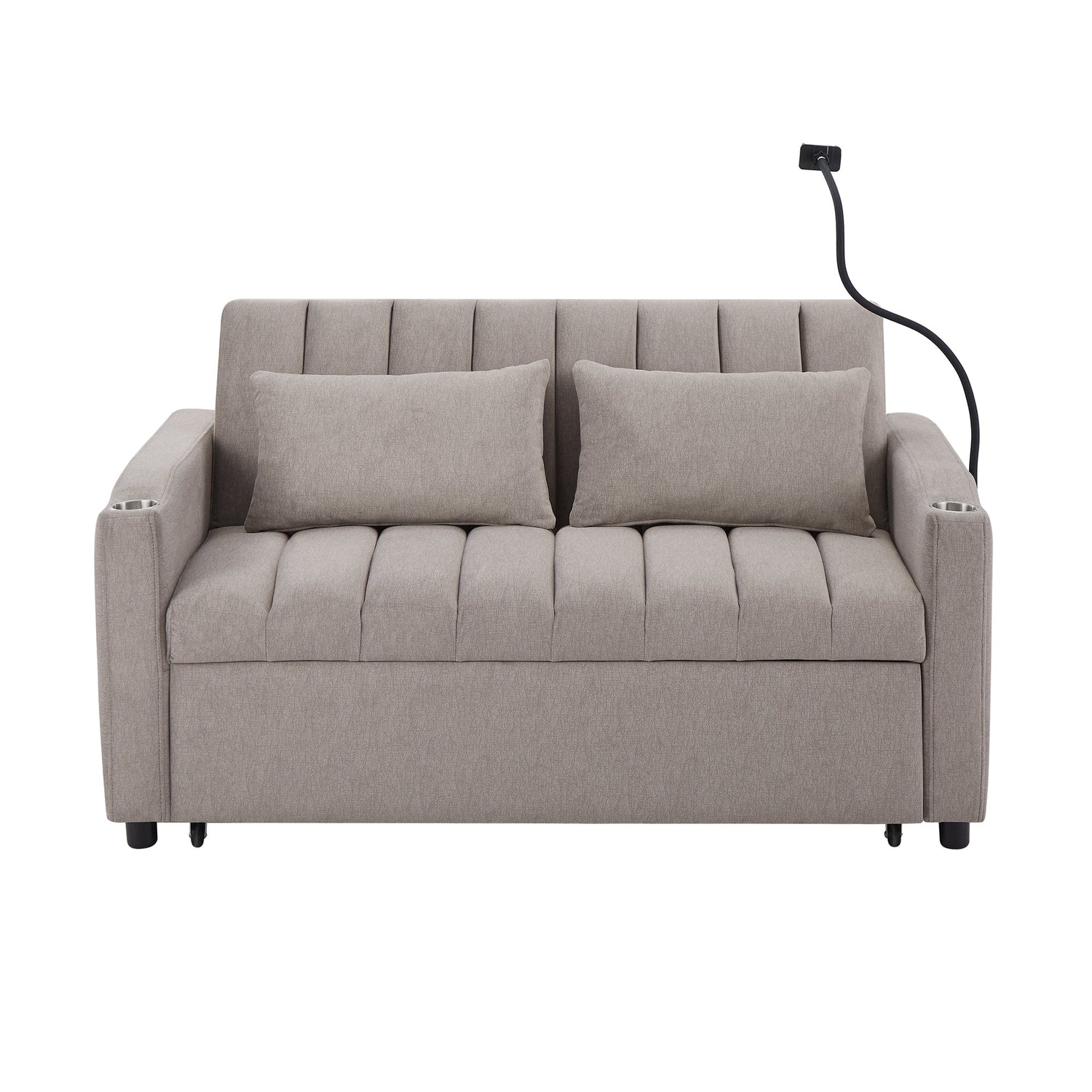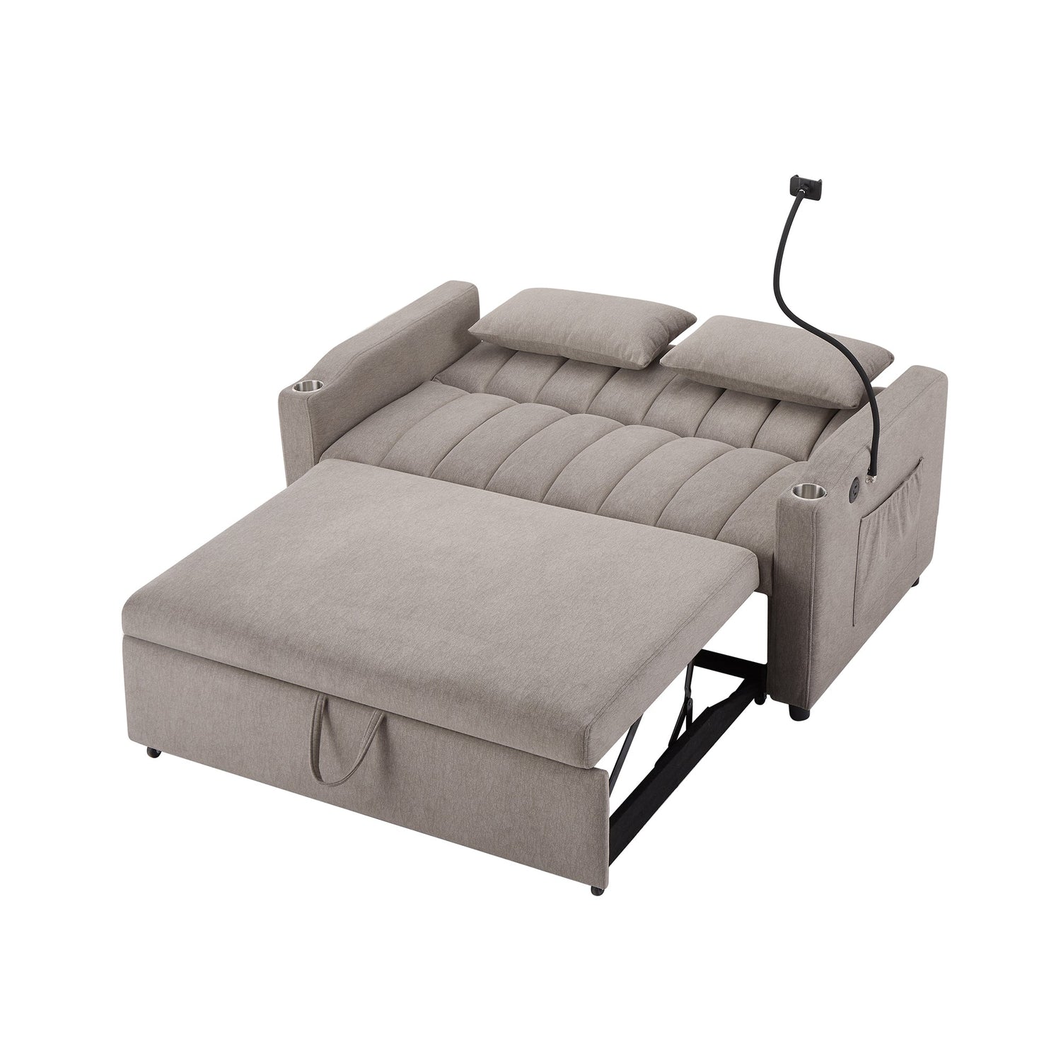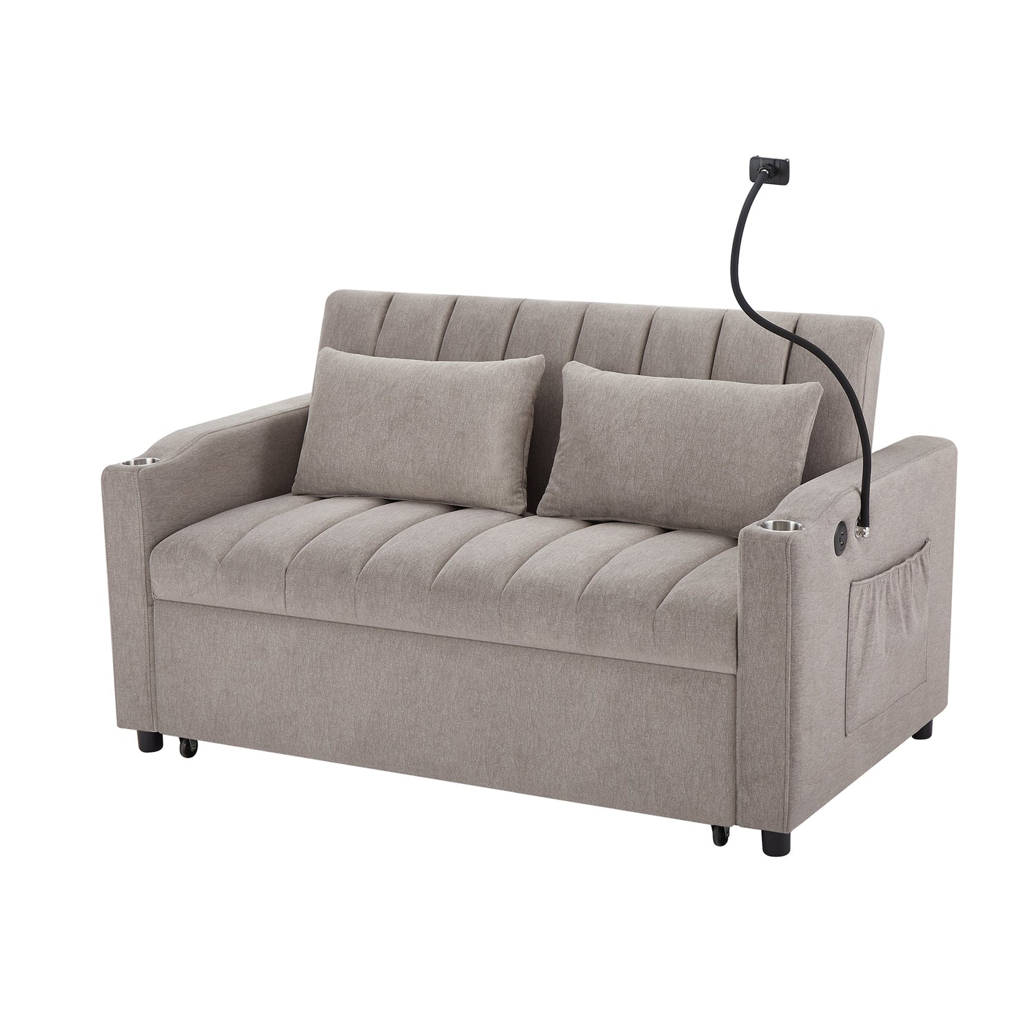 NEW Convertible Sofa Bed Loveseat with USB Ports, Side Pockets, Cup Holders & Swivel Phone Holder, Light Grey Bella Fabric