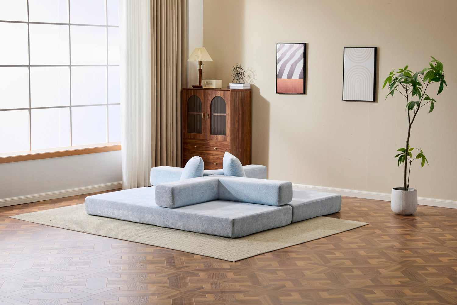 NEW Light Blue Chenille Fabric Floor Couch Compression Convertible Sofa Bed with Pillow Back Support Armrest Comfy Futon Couch Lounge Sleeper Bed