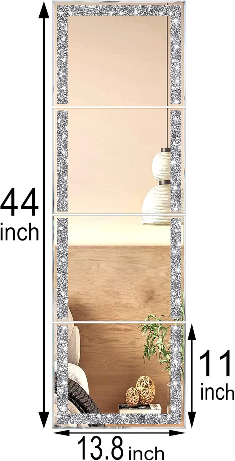 Transform your space with a gleaming, full-length mirror that delivers head-to-toe visibility and a touch of sparkle. Our Crystal Crush Diamond Full Length Mirror Tiles come as a four-piece set of 14" x 11" glass tiles that, when installed, form a dramatic frameless panel measuring about 44" x 13.8".