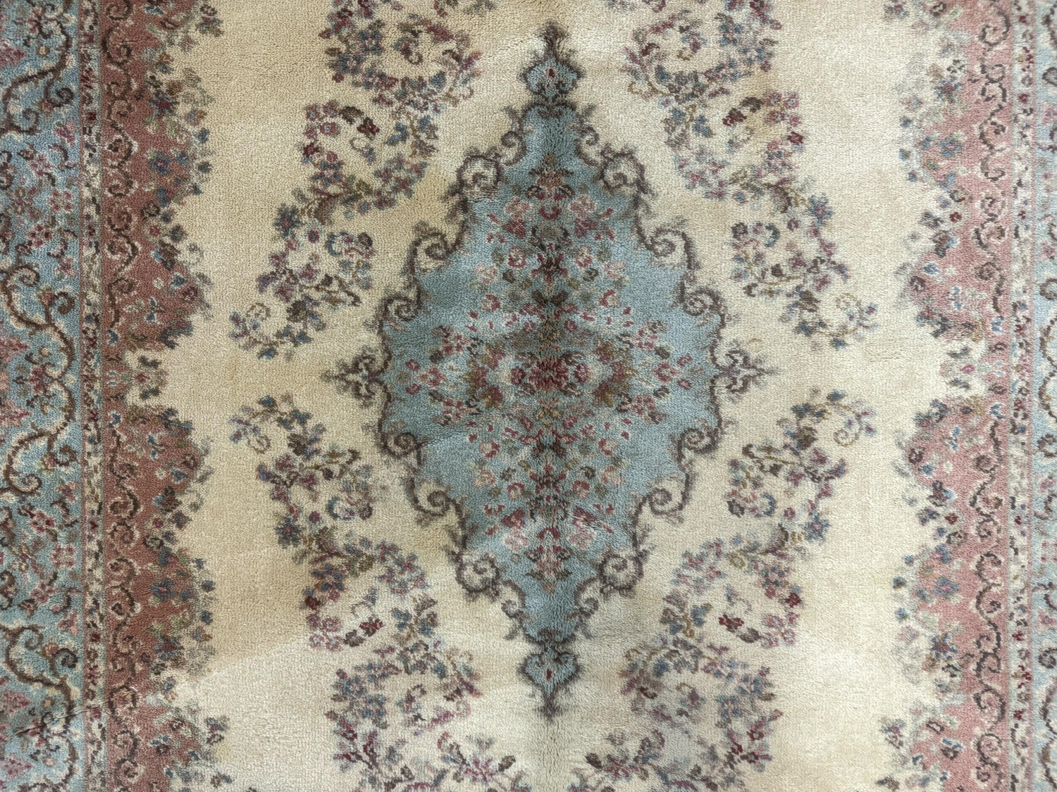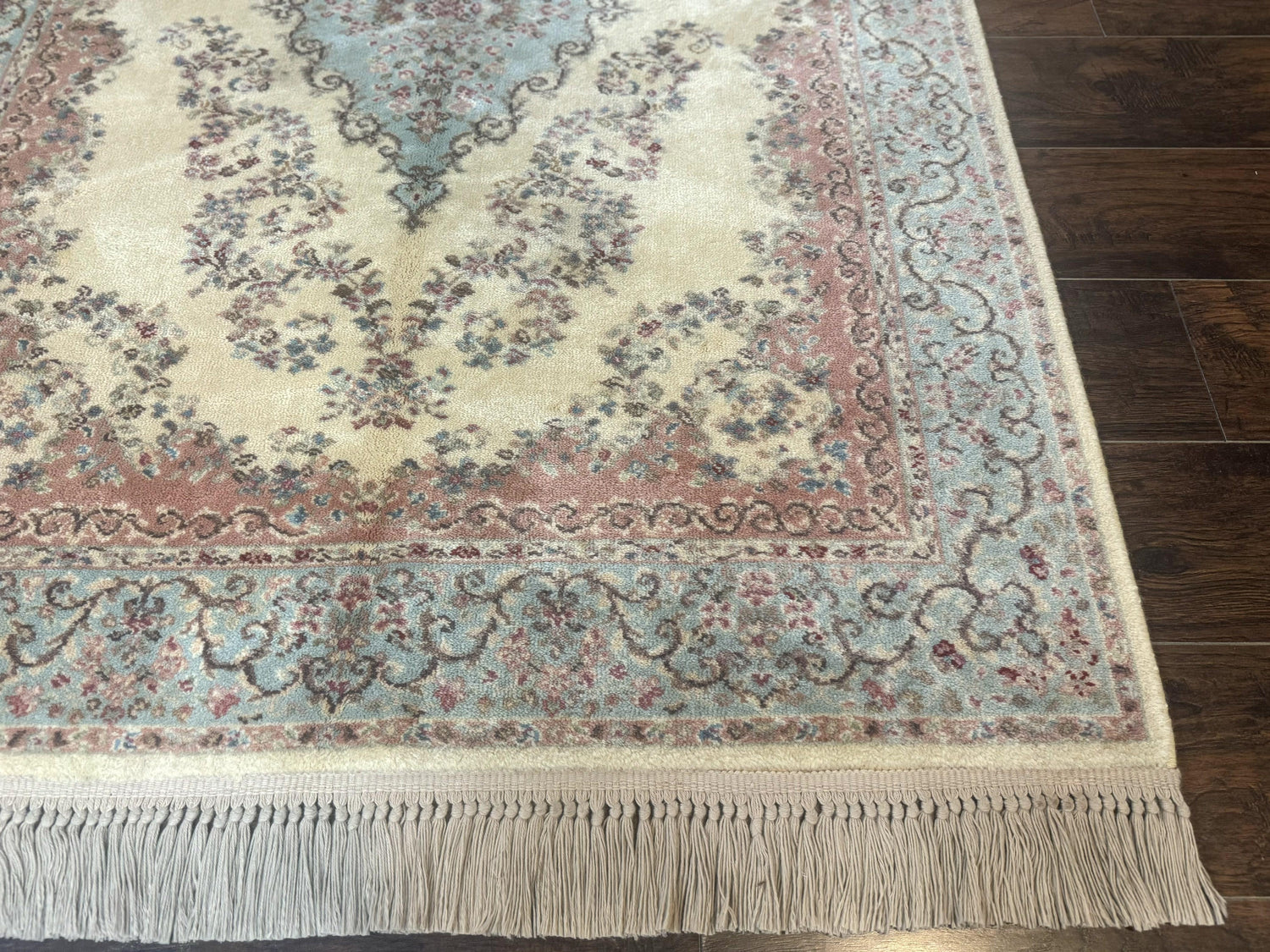 A Pretty Vintage Power-Loomed Wool Karastan Pastel Ivory Kirman #784 Area Rug. A great way to transform any space.