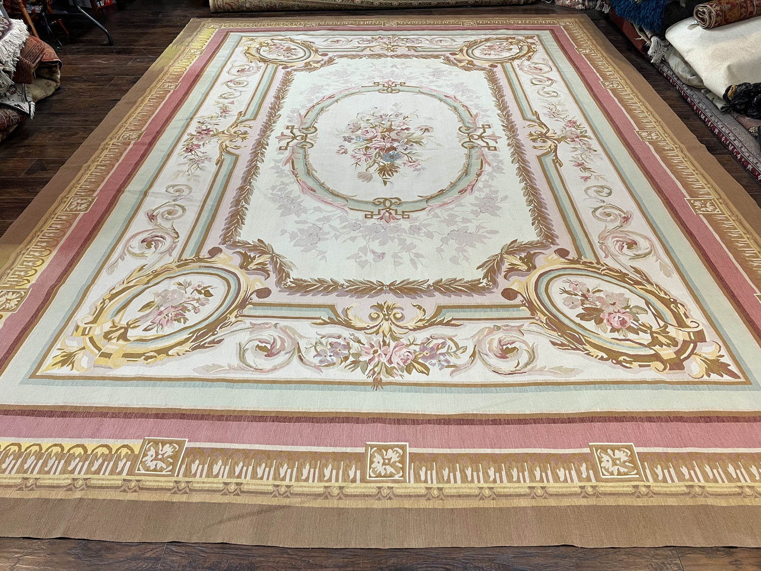 USED Large Aubusson Rug 11x15, Oversized Gallery Palace Size Flatweave Savonnerie Carpet 11 x 15 ft, Wool Handmade Vintage Elegant European