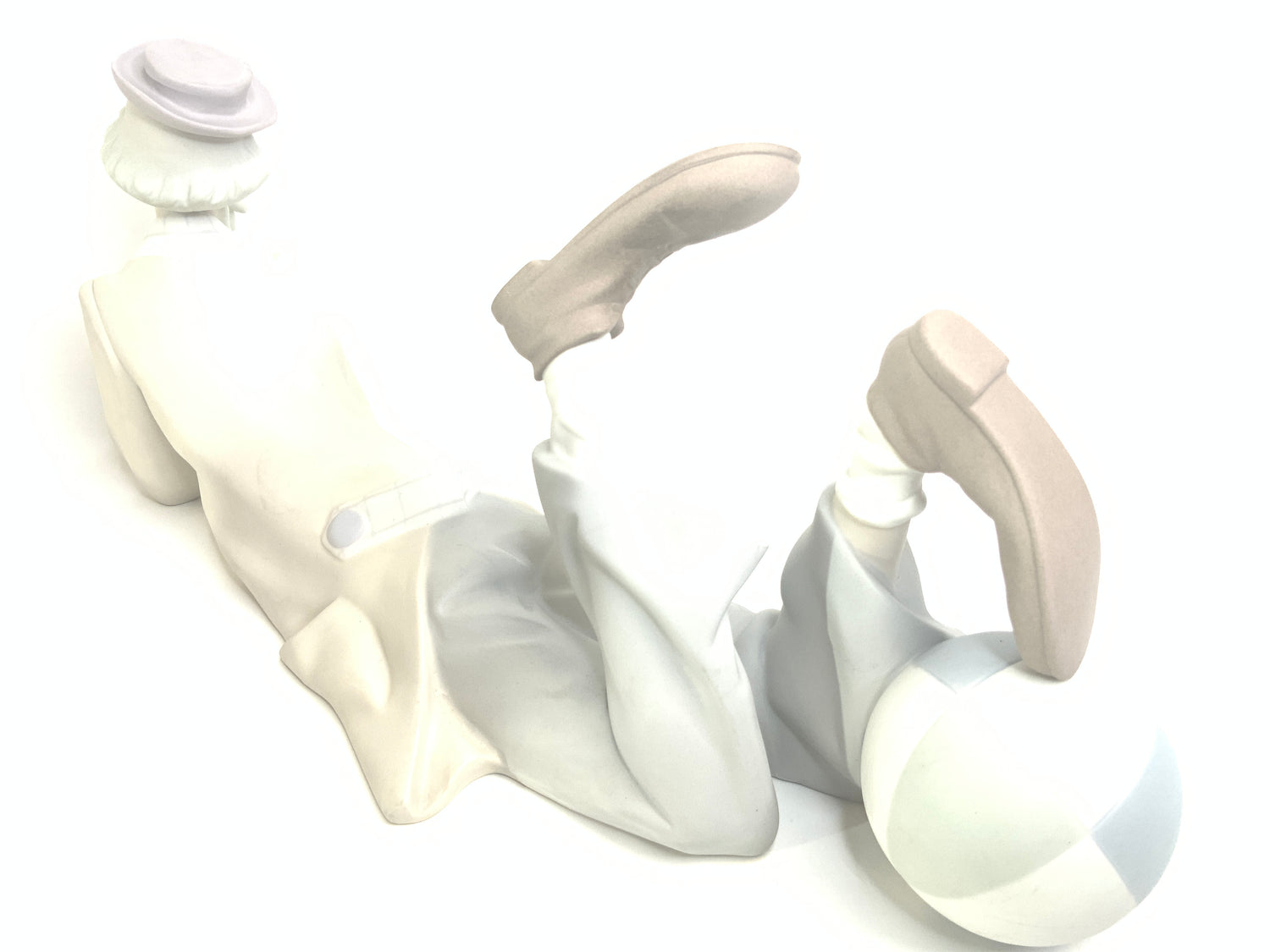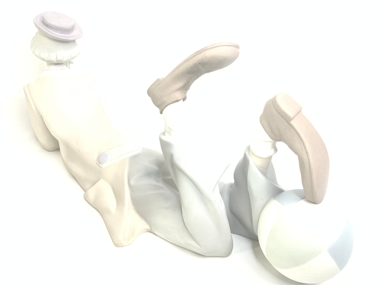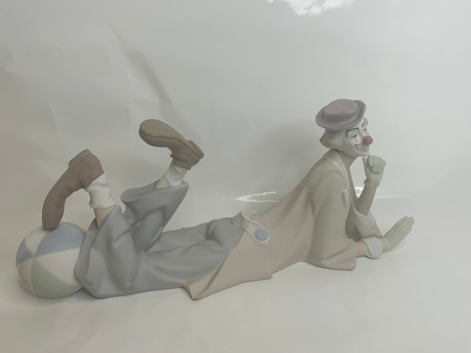 Lladro porcelain reclining clown #4618 by Salvador Furio, with ball under his foot. Measures 14.5"L x 6.25"H x 4.75"W. Condition report: good overall condition, no issues, see photos. Please examine all photos closely.