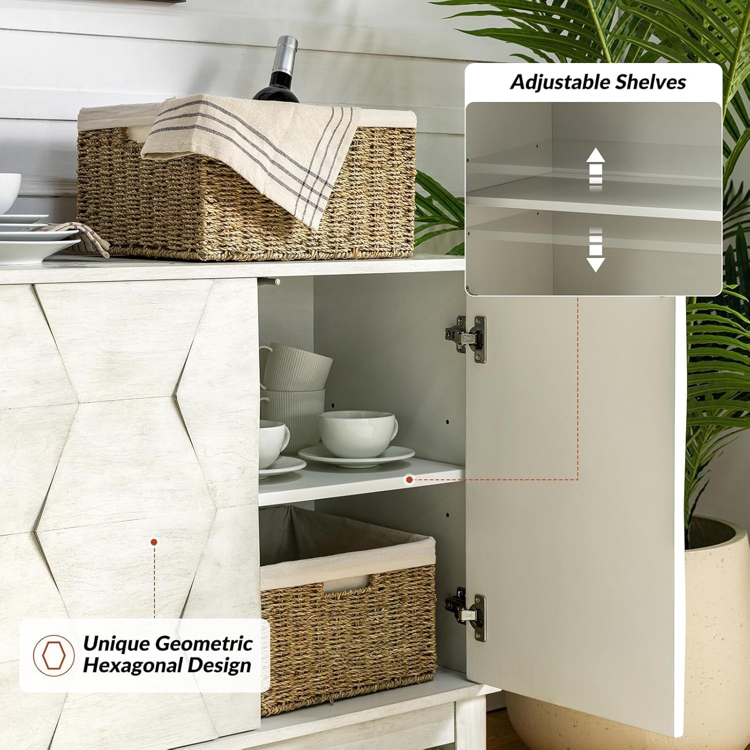 - 4 doors + 2 interior shelves provide generous, neatly organized storage for dinnerware, linens, and essentials.