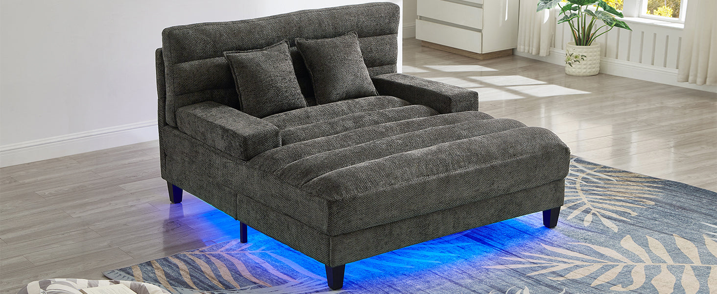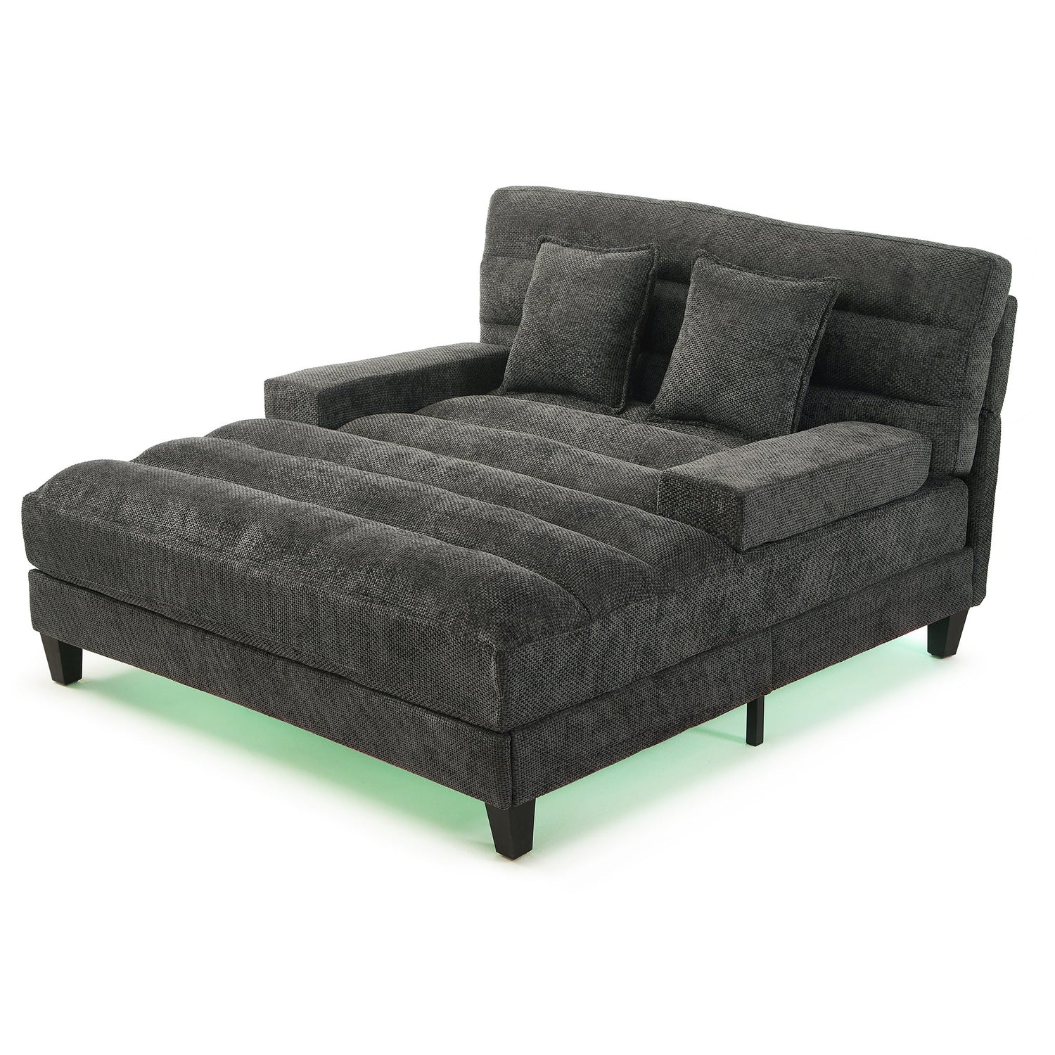 NEW Grey Chenille LED Light Strip Upholstered Modern Chaise Lounge Sofa Bed