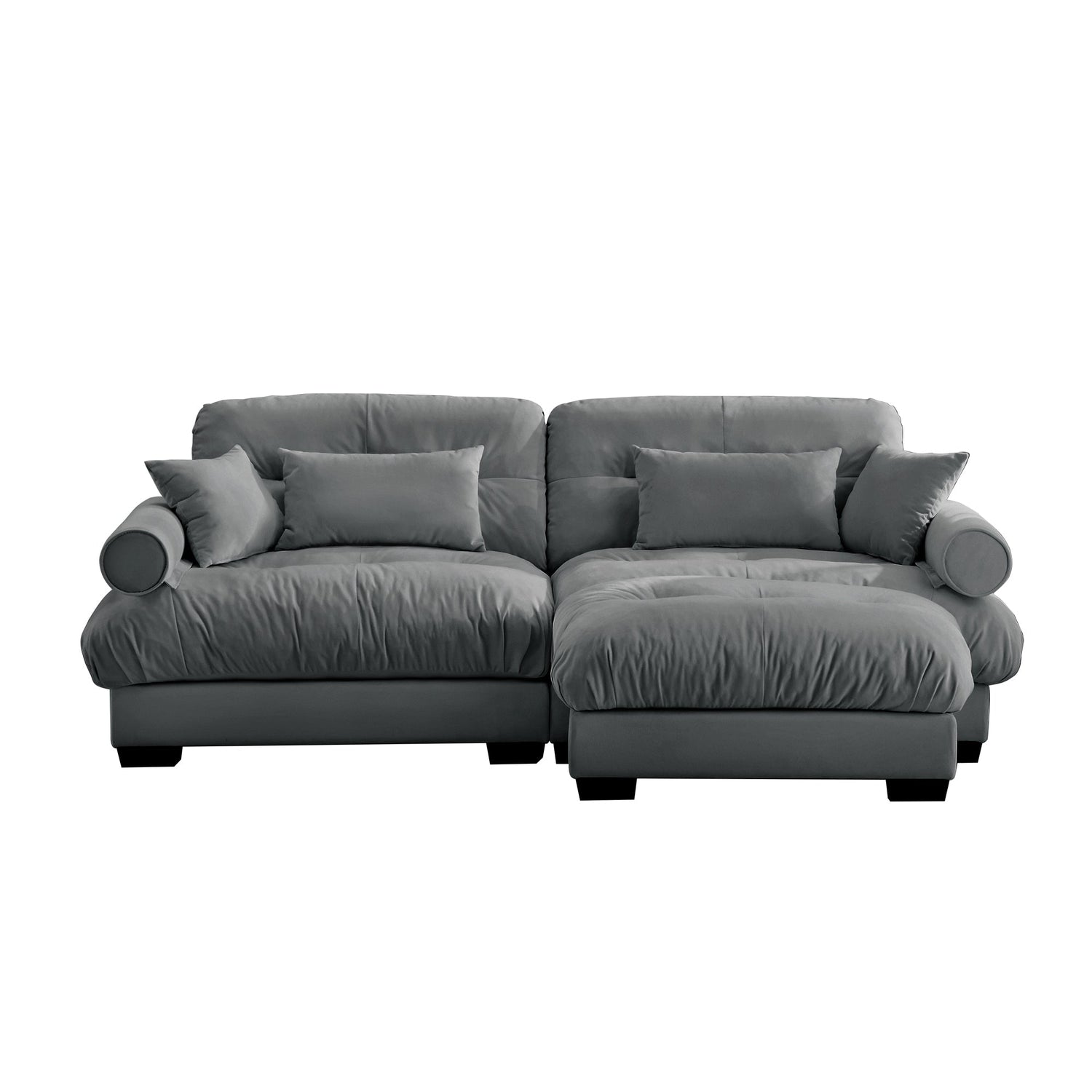 NEW Modern Grey Velvet Two-Seater Sofa with Ottoman and Round Bolster Armrests L Shape