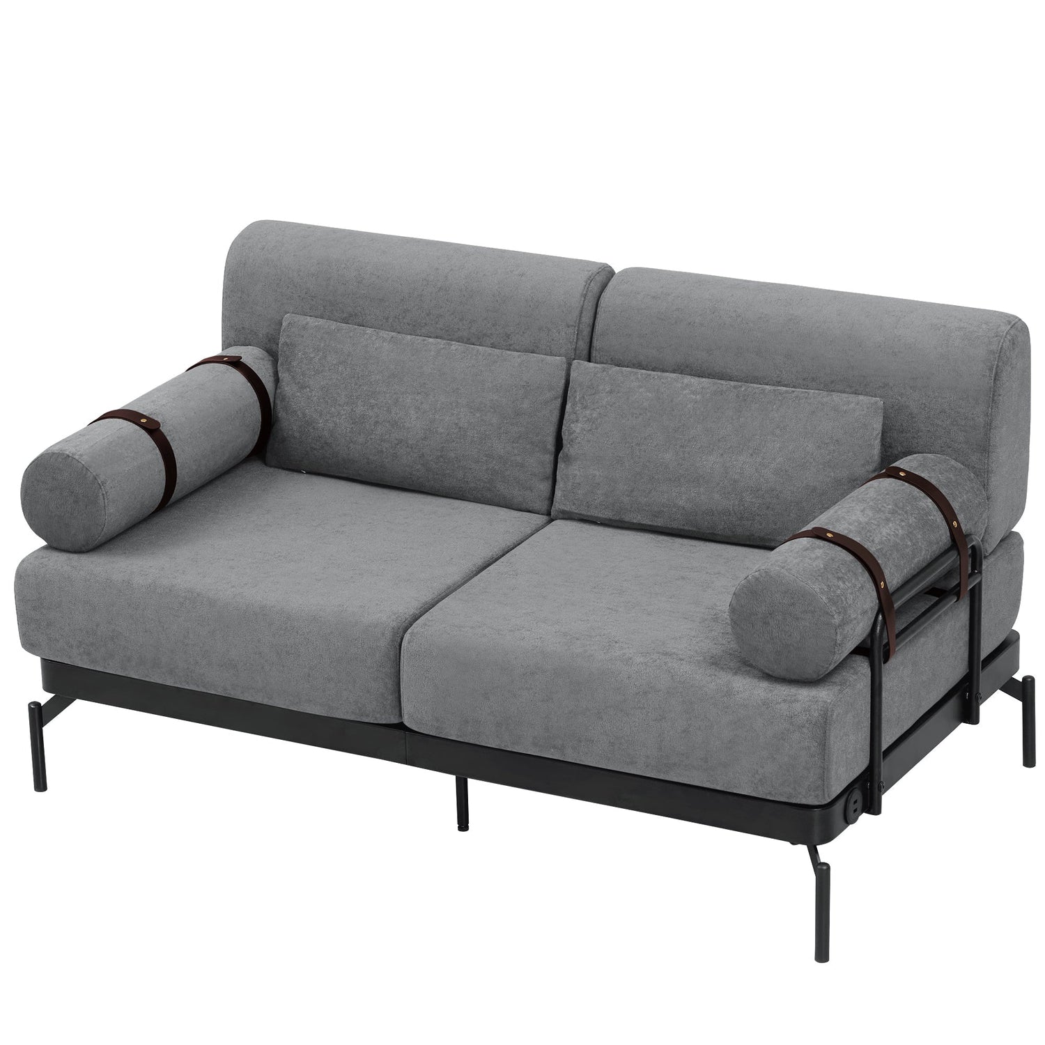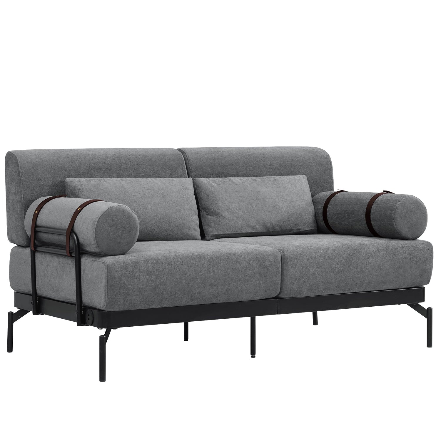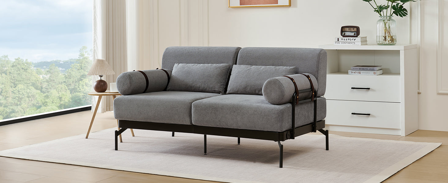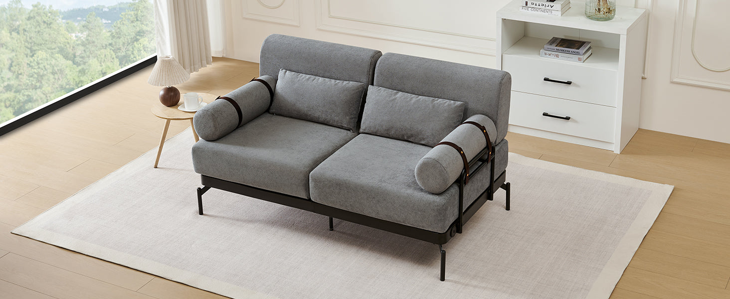 - Unique Cylindrical Armrest Design - This loveseat sofa features two uniquely designed cylindrical armrests wrapped with adjustable faux leather straps, offering both aesthetic appeal and practical support. The bold, modern design adds an eye-catching architectural accent, setting it apart from traditional sofas.