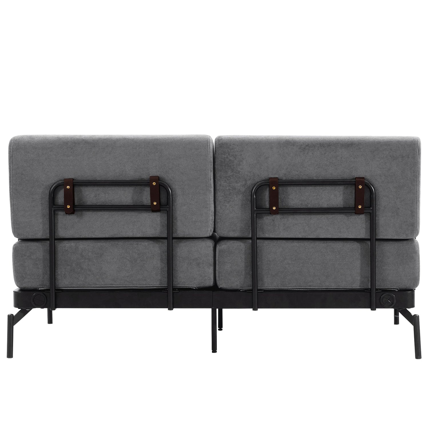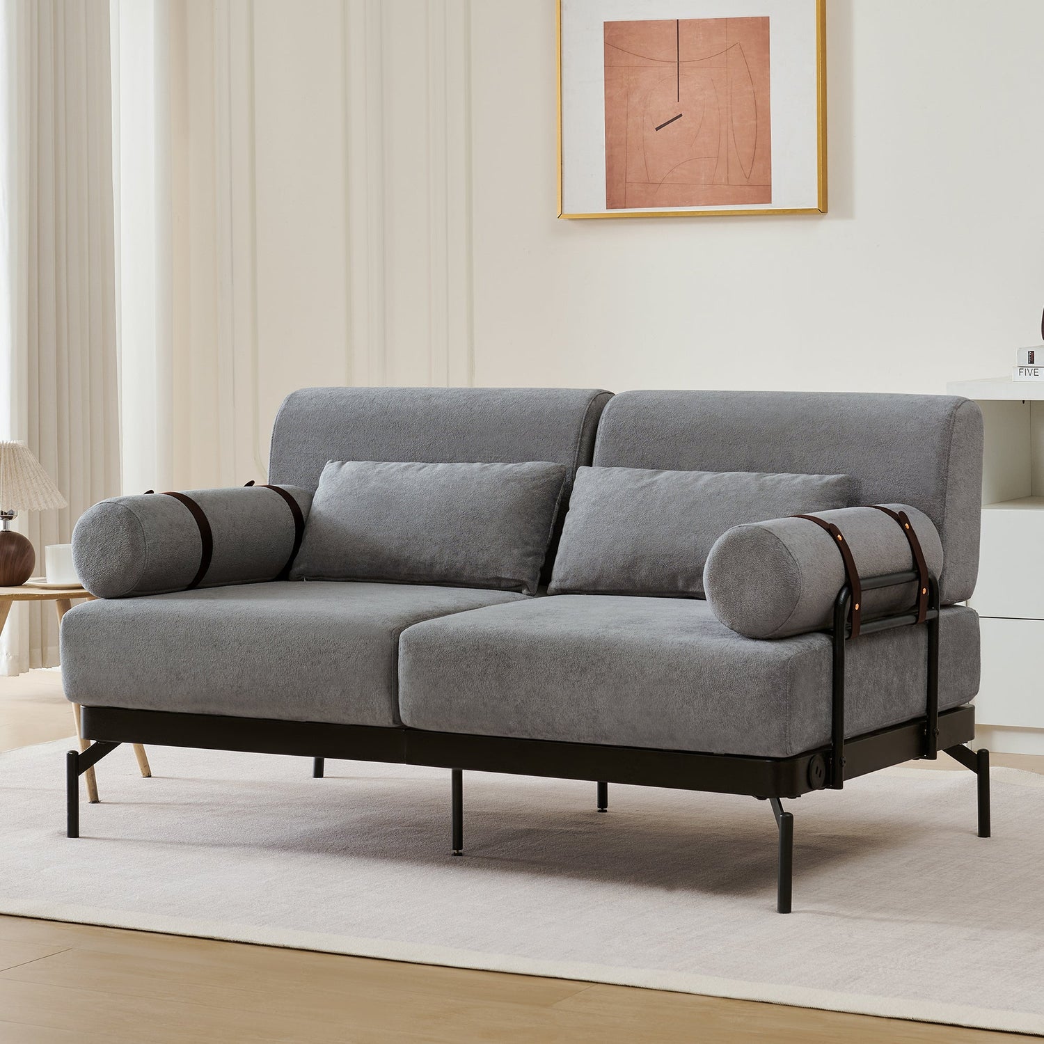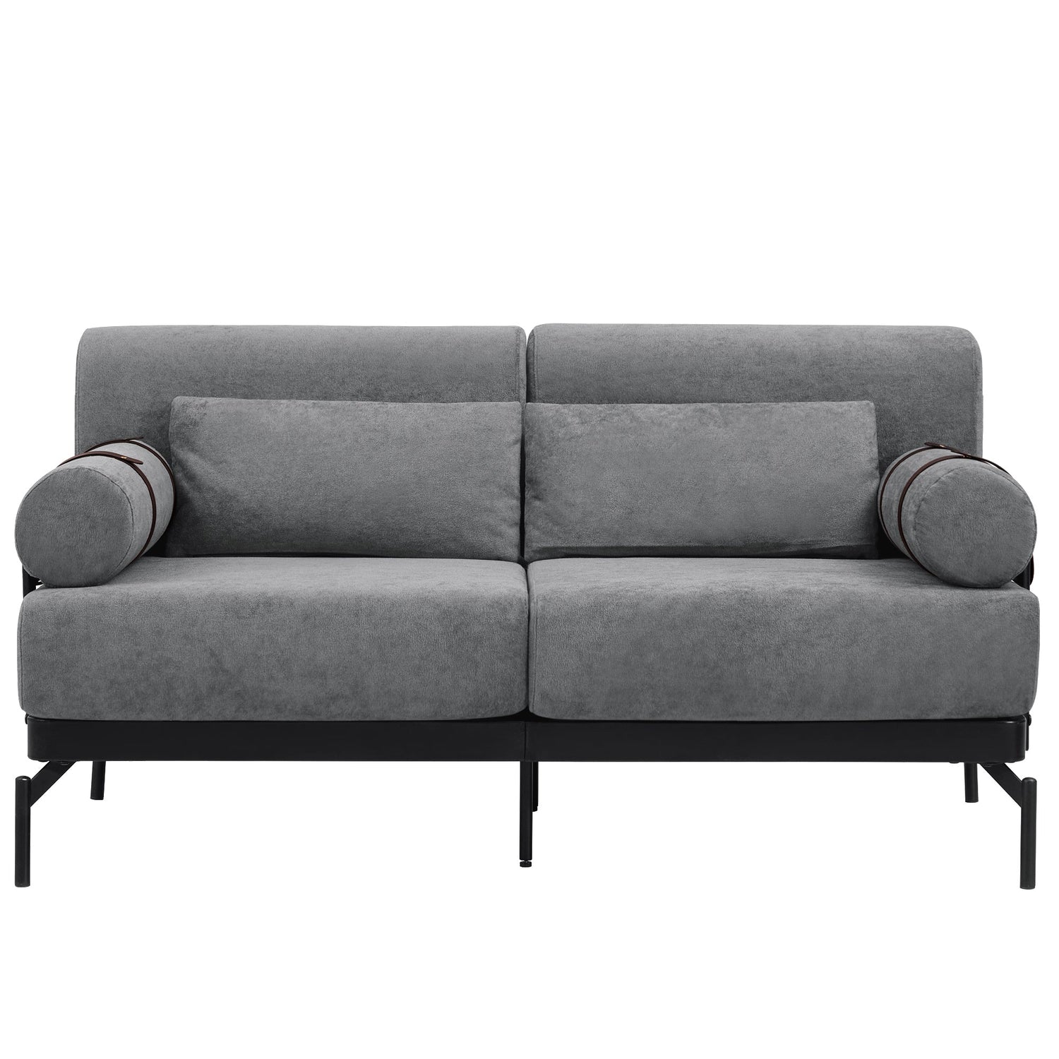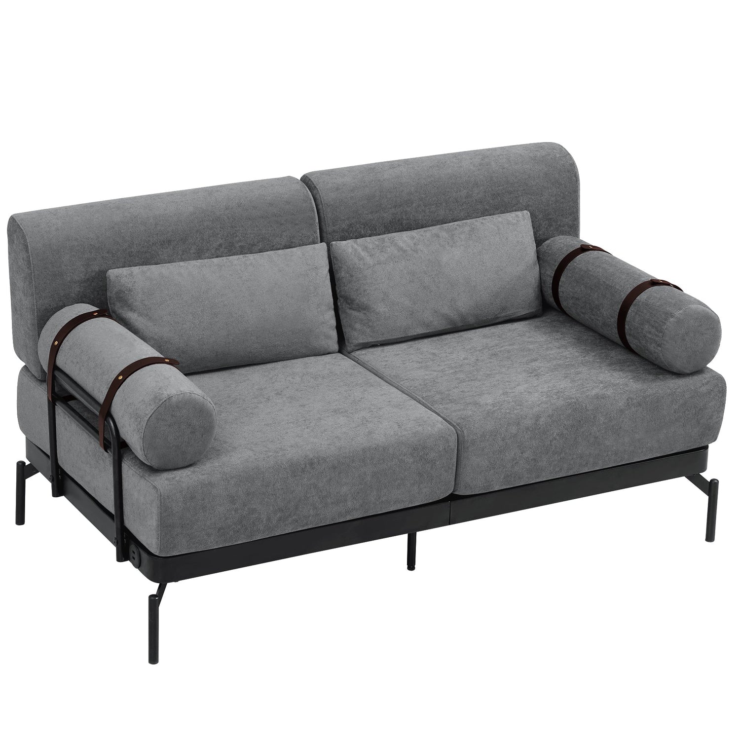 - Unique Cylindrical Armrest Design - This loveseat sofa features two uniquely designed cylindrical armrests wrapped with adjustable faux leather straps, offering both aesthetic appeal and practical support. The bold, modern design adds an eye-catching architectural accent, setting it apart from traditional sofas.