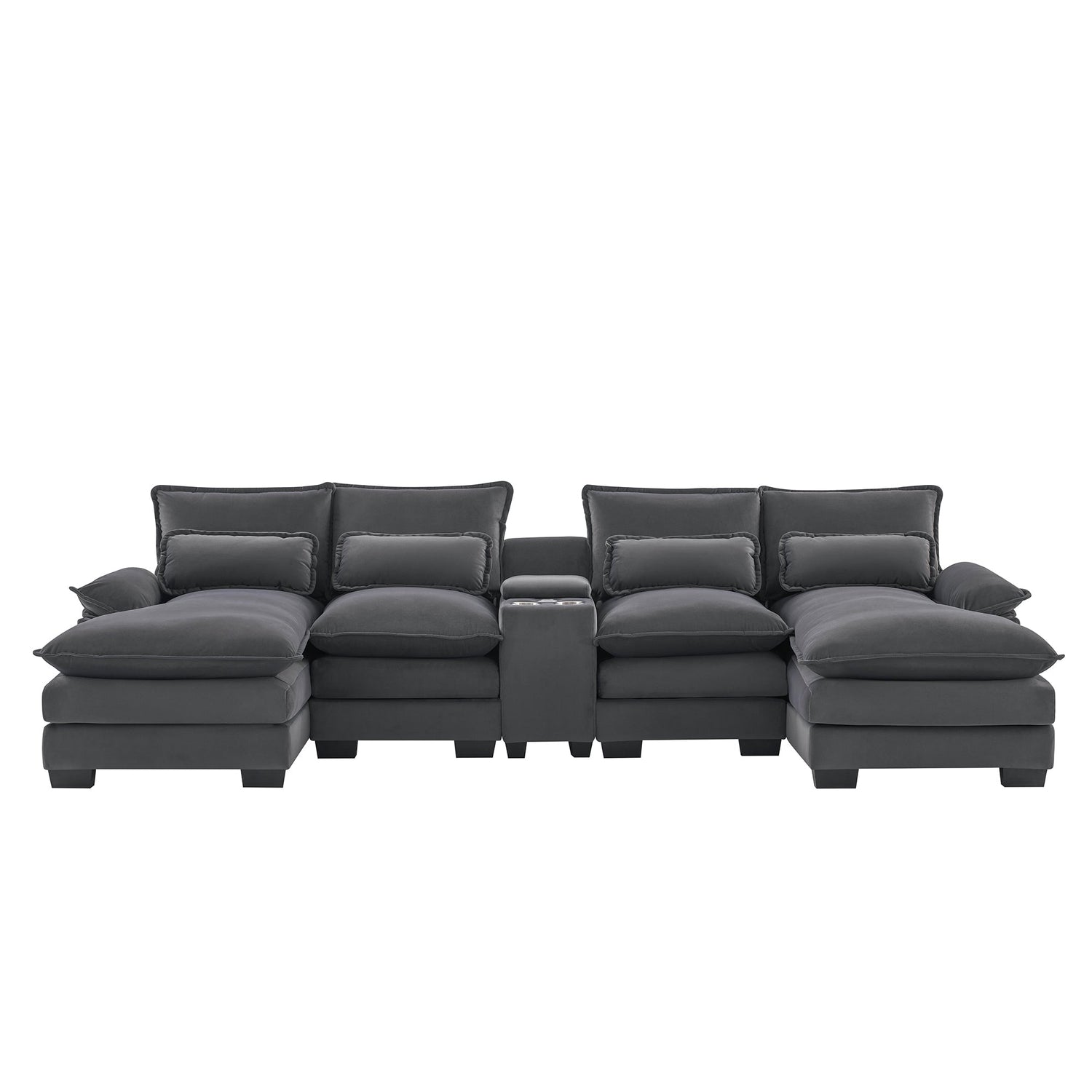 NEW Modern Gray Velvet Upholstered U-shaped 6-Seat Sofa with Console Cupholders and USB Ports