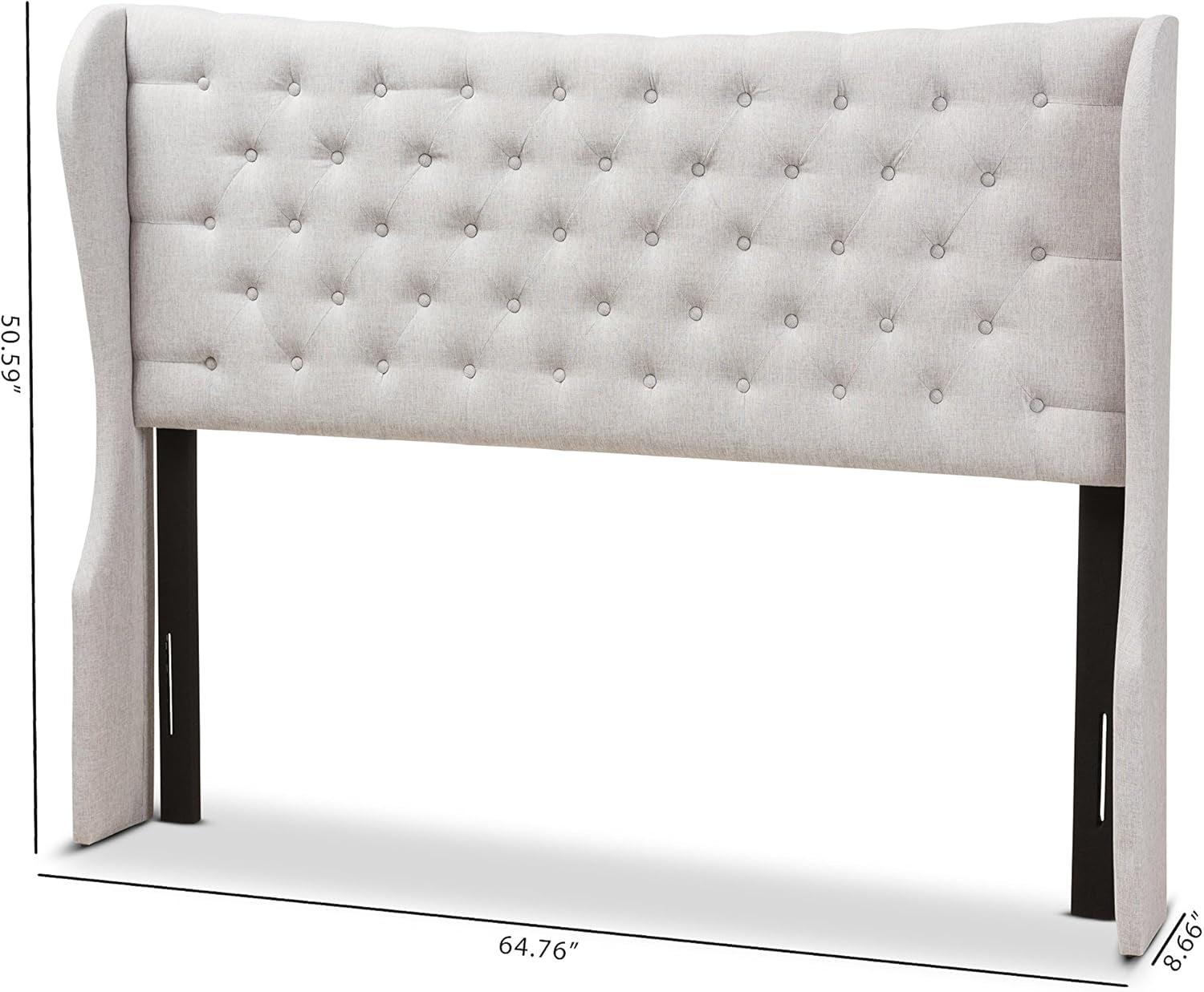 Introducing the Modern Winged Headboard with Button-Tufting and Nail Heads, a stunning addition to your bedroom furniture collection. This contemporary headboard is expertly crafted to enhance your bed's aesthetic while providing a touch of elegance. Featuring a sophisticated greyish beige fabric upholstery, this piece blends seamlessly with various decor styles. The distinctive button-tufting design paired with silver nail head trim adds a luxurious and refined look, making it an eye-catching focal point in any bedroom.