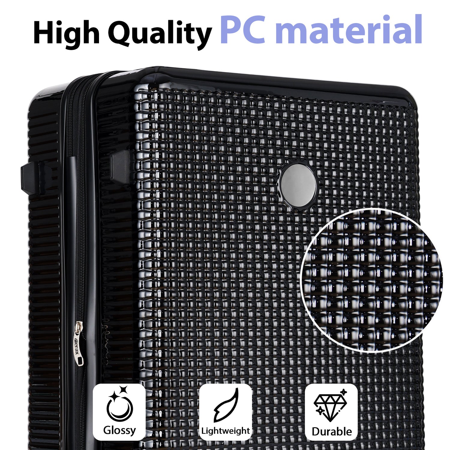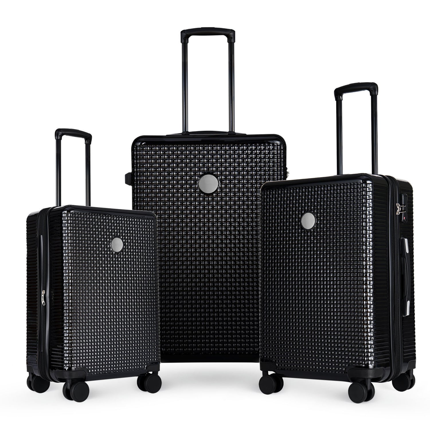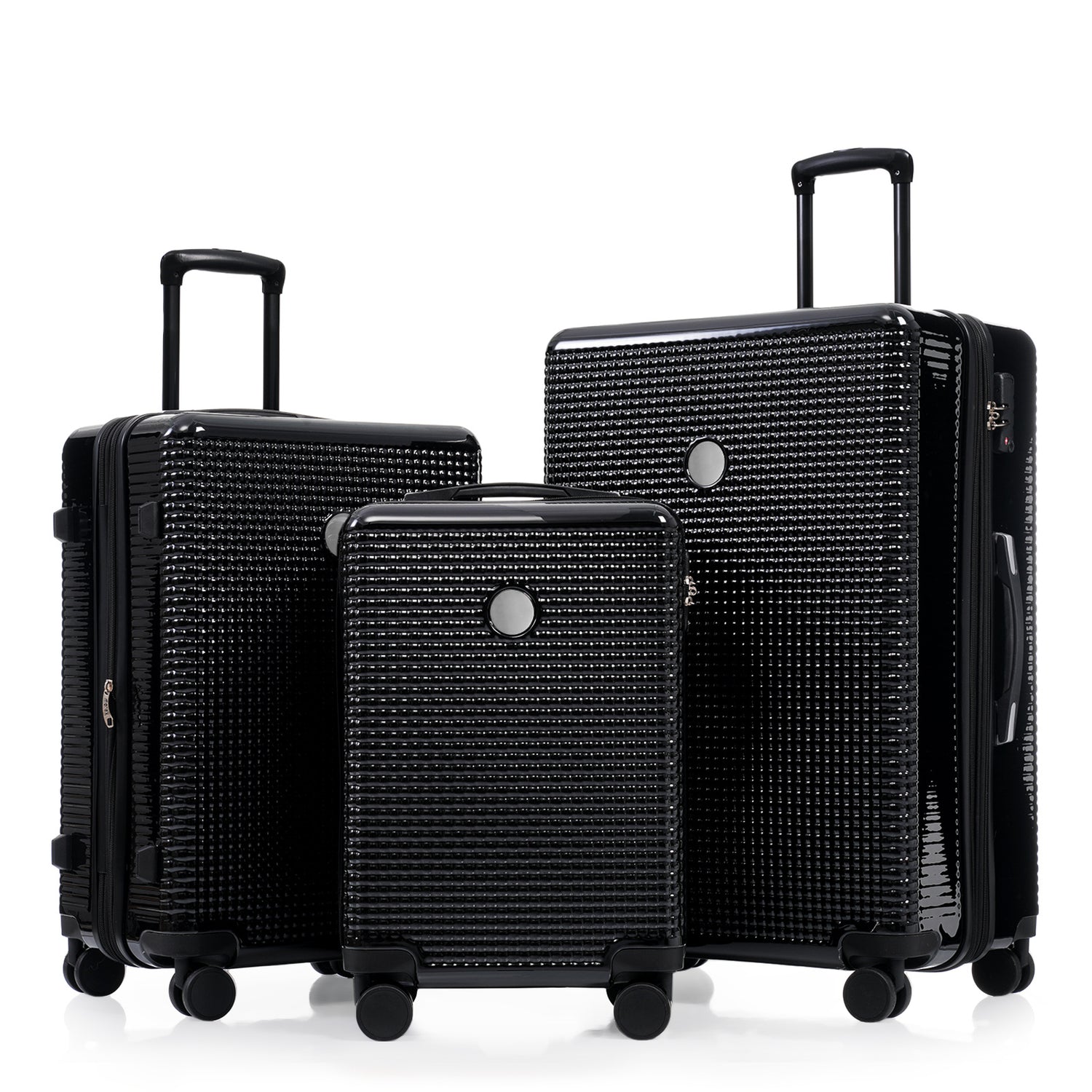 Luggage set is made of ABS+PC material, which is light and strong, flexible and impact-resistant, and can withstand extrusion and collision during transportation. The surface of the suitcase is covered with regular dot patterns and has a beautiful gloss.