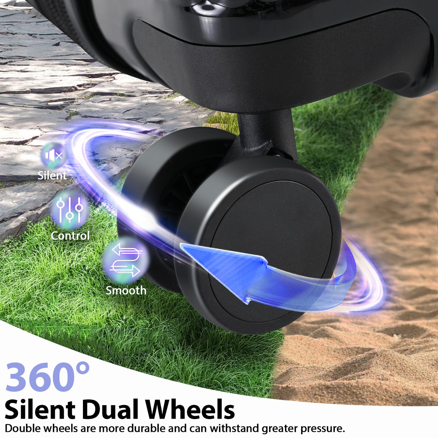The telescopic handle is adjustable and sturdy, suitable for people of different heights. The 360° dual spinner wheels are highly maneuverable and move quietly and smoothly while on the go.