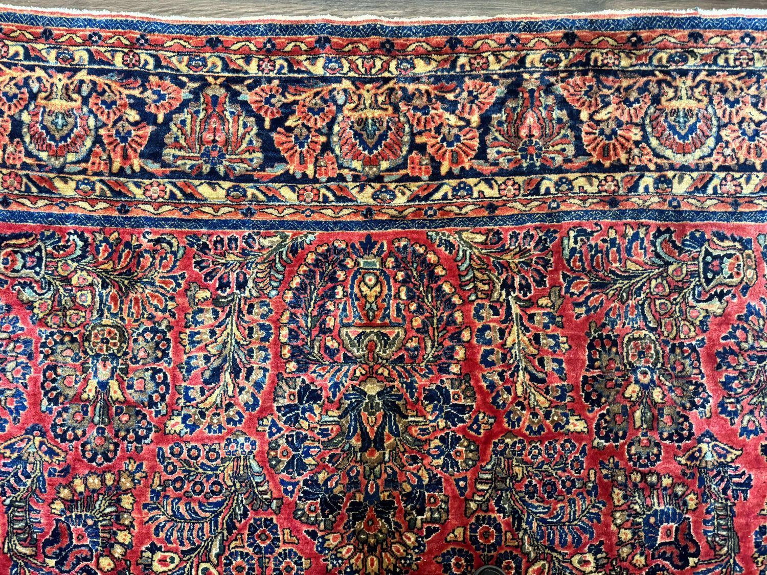 Measuring an impressive 10x16, this antique Persian Sarouk rug was designed to make a statement in grand spaces. The rug features a dramatic floral medallion pattern framed by dense sprays of palmettes, with a vibrant red field that provides a rich backdrop to its navy and ivory detailing. The scale of the design feels both regal and intimate, with exquisite symmetry that draws the eye inward. This piece dates to the 1920s and displays exceptional craftsmanship and balance, perfect for anchoring a large room with warmth and character.