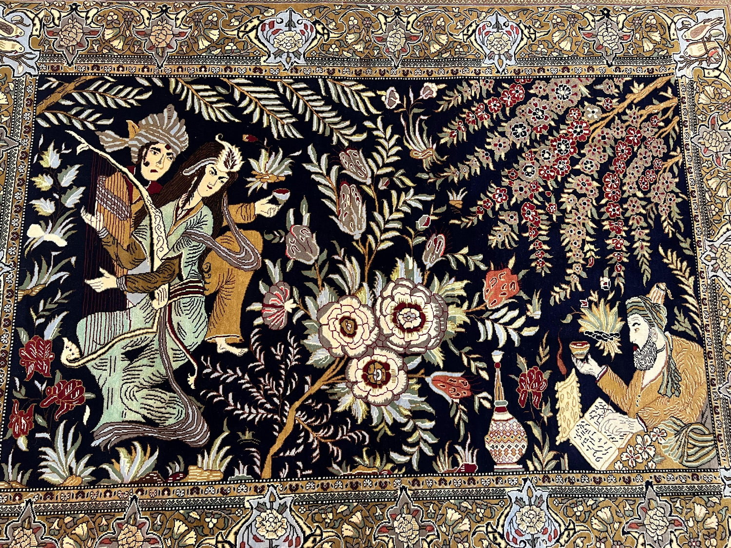 This Qum rug showcases a highly detailed pictorial scene of Layla & Majnun, famous lovers from Persian literature, set against a deep black background with gold, cream, red, green, blue, and beige accents. The intricate floral and bird motifs add to the rug's charm. The super fine kork wool and hand-knotted technique highlight the superior craftsmanship and artistic expression, making this a valuable and unique addition to any collection.