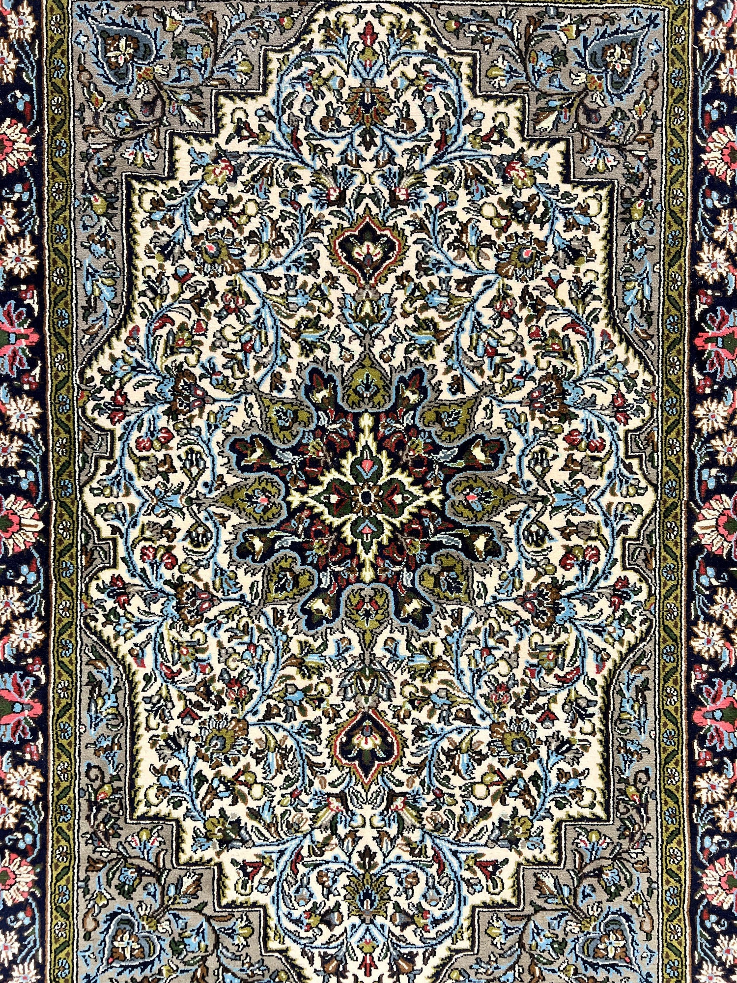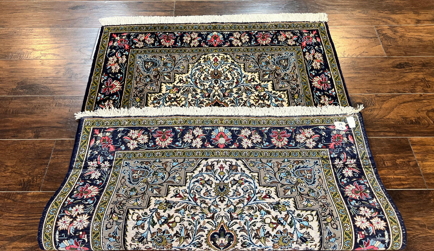 USED Persian Qum Rug 3x5, Wool with Silk Highlights, Handmade Semi Antique Carpet, Ivory & Navy Blue, Floral Medallion, Finely Hand Knotted