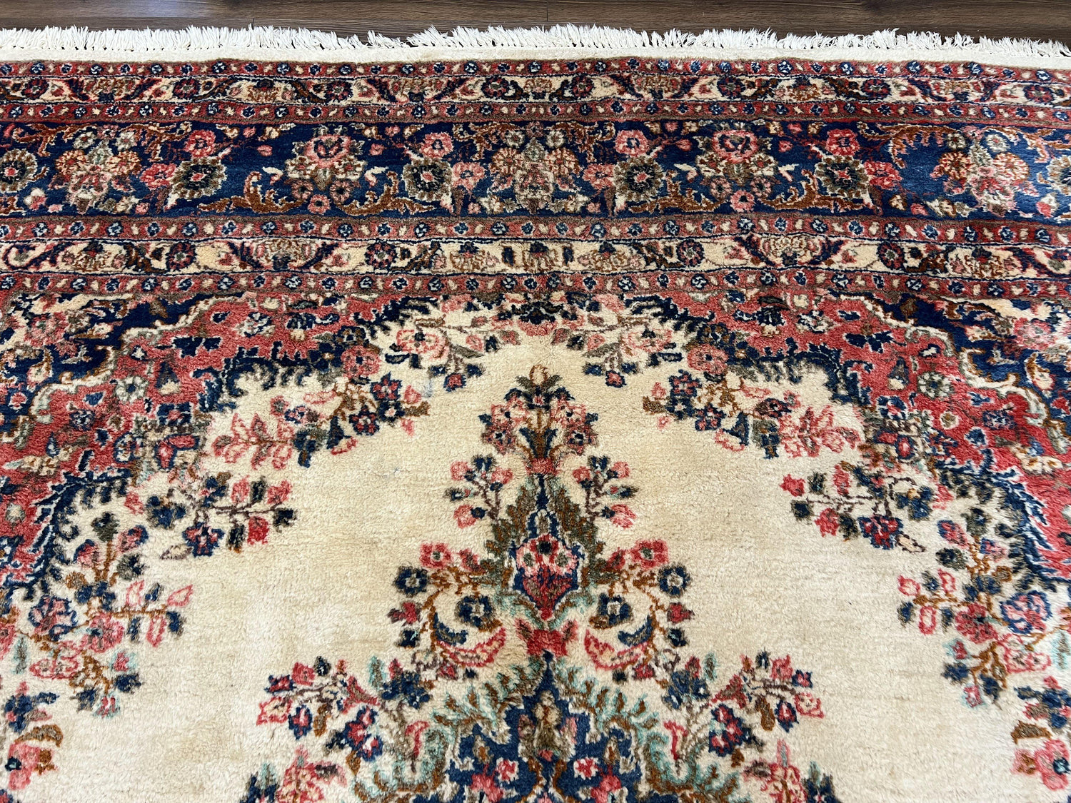 USED Persian Rug 9x10, Hamadan Rug, Antique Oriental Carpet, Wool Rug, Semi Open Field, Cream and Navy Blue, Kirman Design Hand Knotted Almost Square Rug