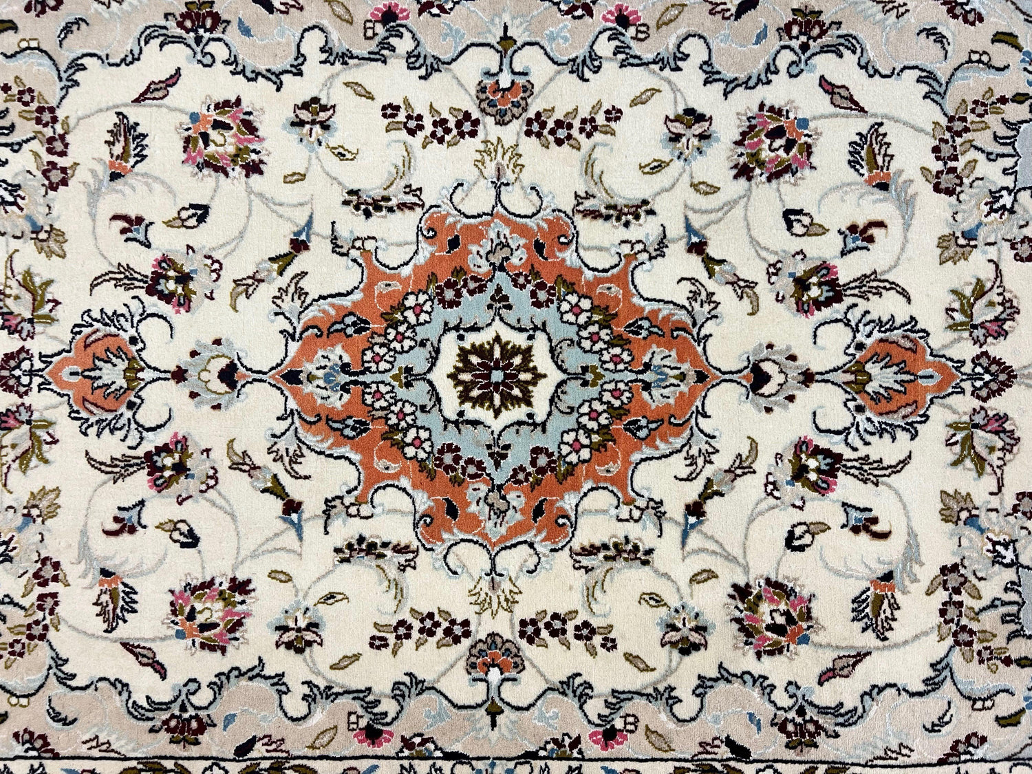USED Persian Tabriz Rug 4.5 x 6.8, Finely Hand Knotted Wool with Silk Highlights Vintage Oriental Carpet, Cream and Salmon, High KPSI, Floral Medallion