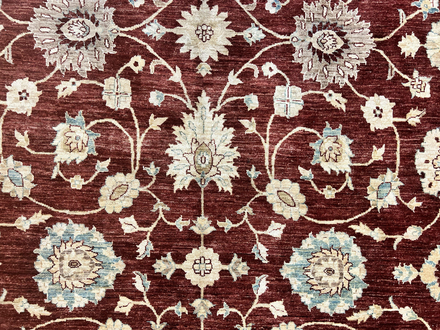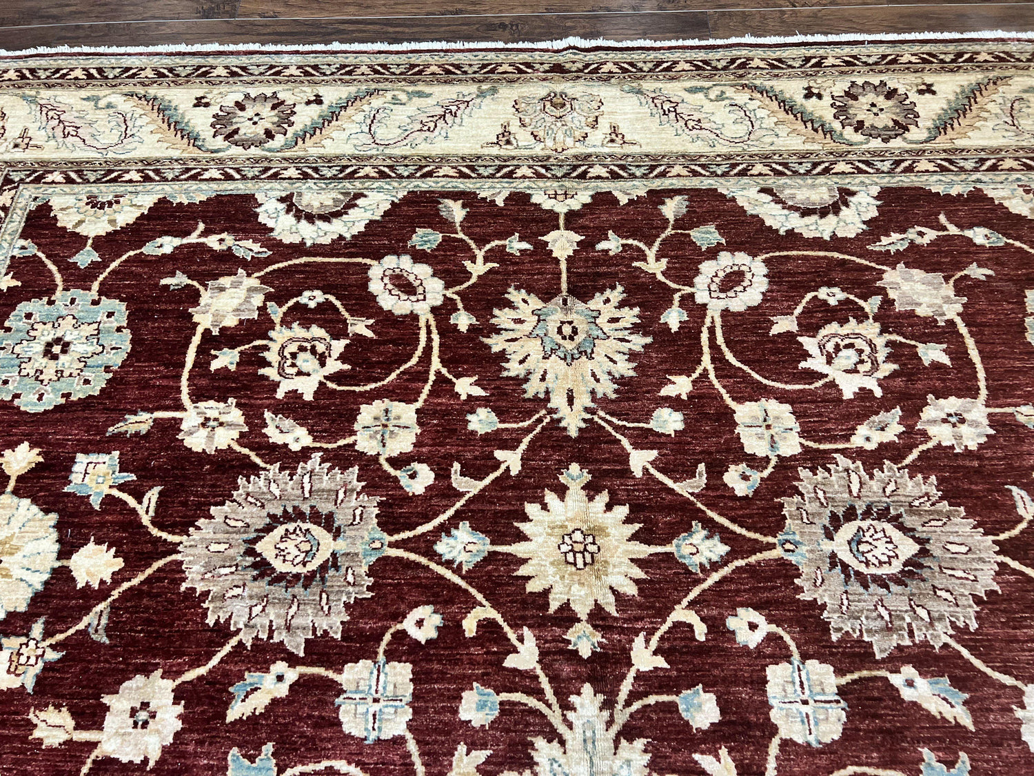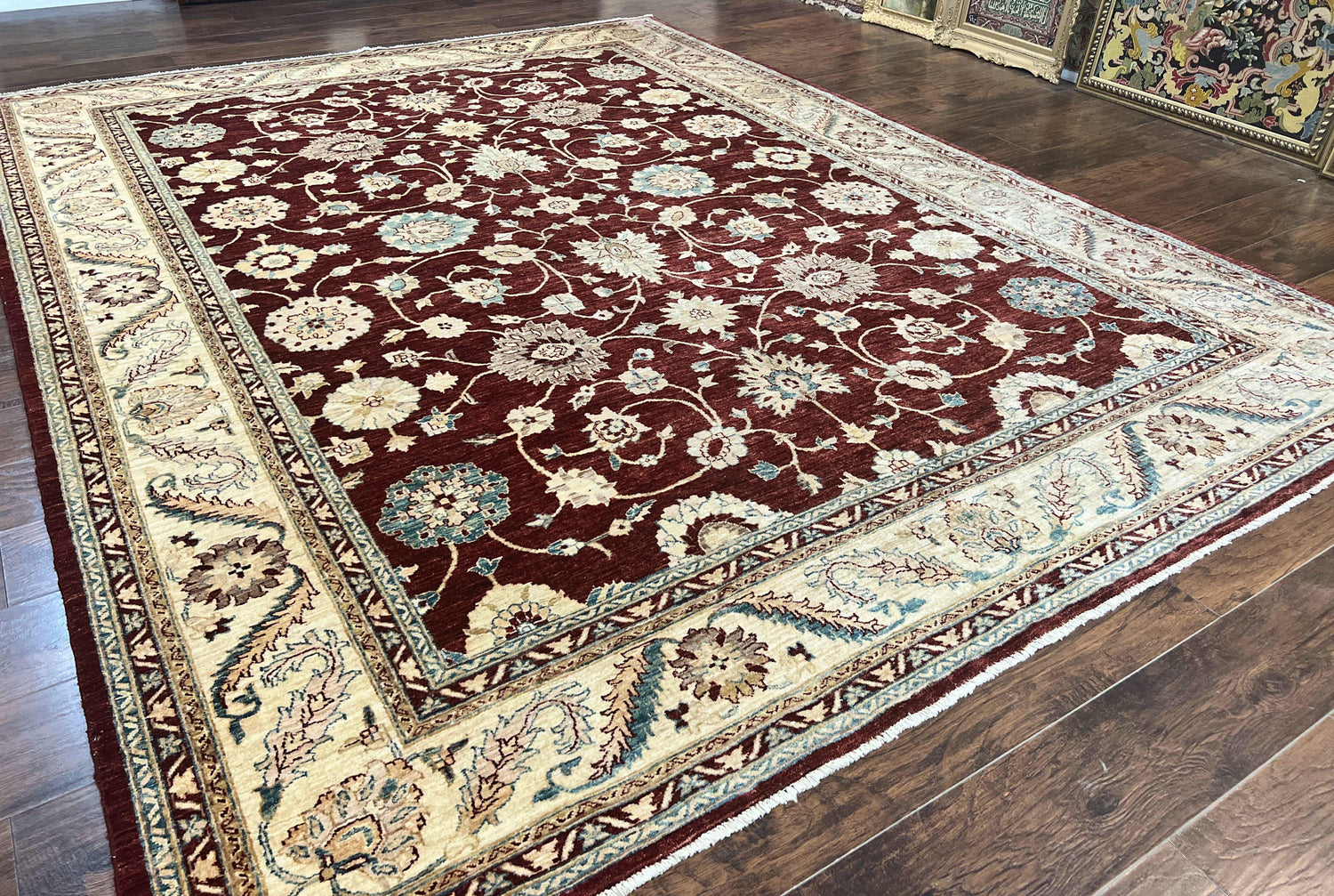 USED Peshawar Rug 9x11, Pakistani Oriental Carpet, Maroon and Beige, Floral Allover, Wool Hand Knotted Handmade Vintage Rug