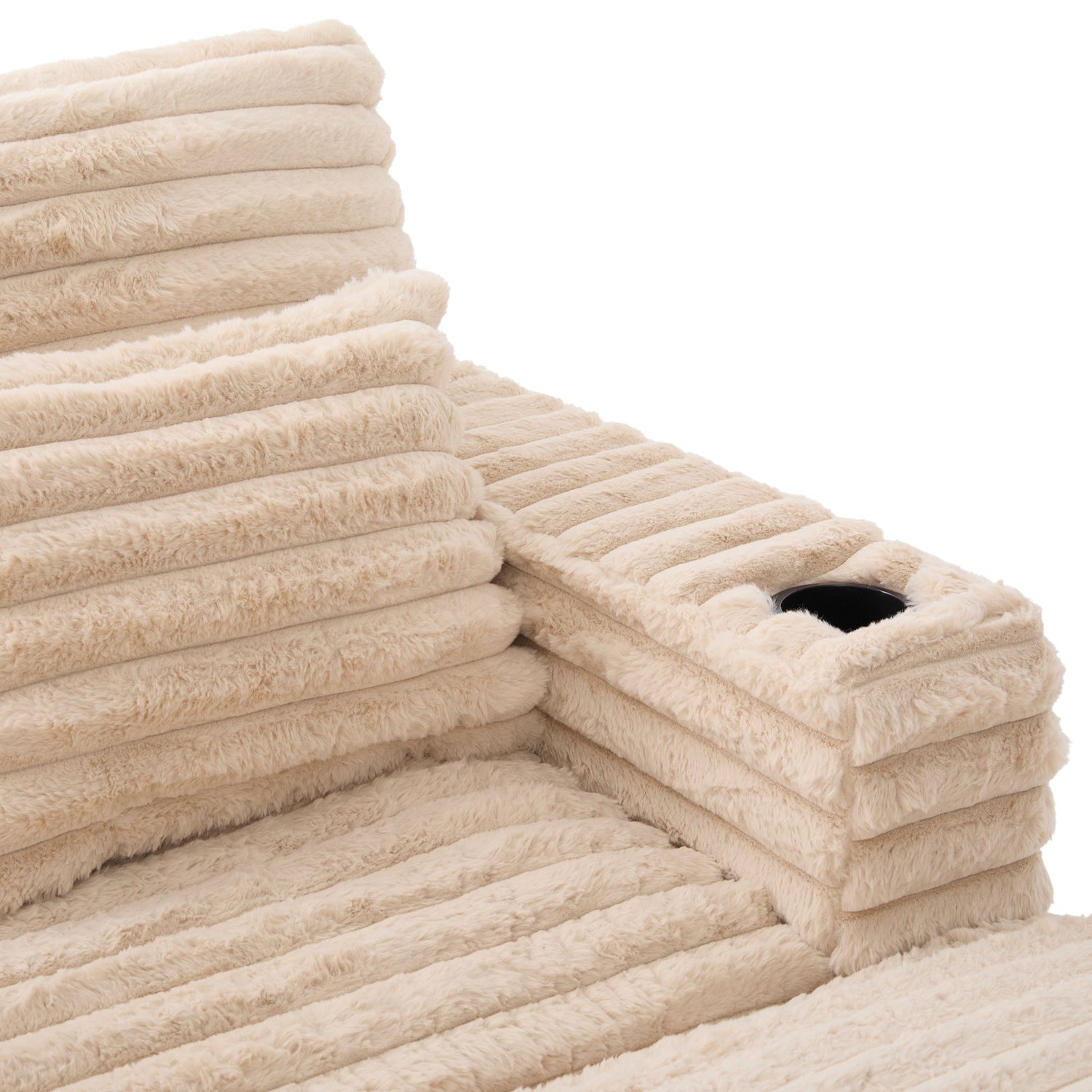 This double chaise lounge combines luxurious comfort with practical features, making it a perfect centerpiece for any modern living space. Upholstered in ultra-soft faux rabbit fur with a stylish ribbed texture, it offers a cozy, cloud-like seating experience. The spacious 48-inch seat depth and 9.4-inch thick cushion are ideal for extended lounging, while high-density foam ensures lasting support. Built-in cup holders on both armrests and dual USB ports on the left armrest add everyday convenience. Two lumbar pillows provide personalized support, and the wide chaise design offers ample room for stretching out or sharing.