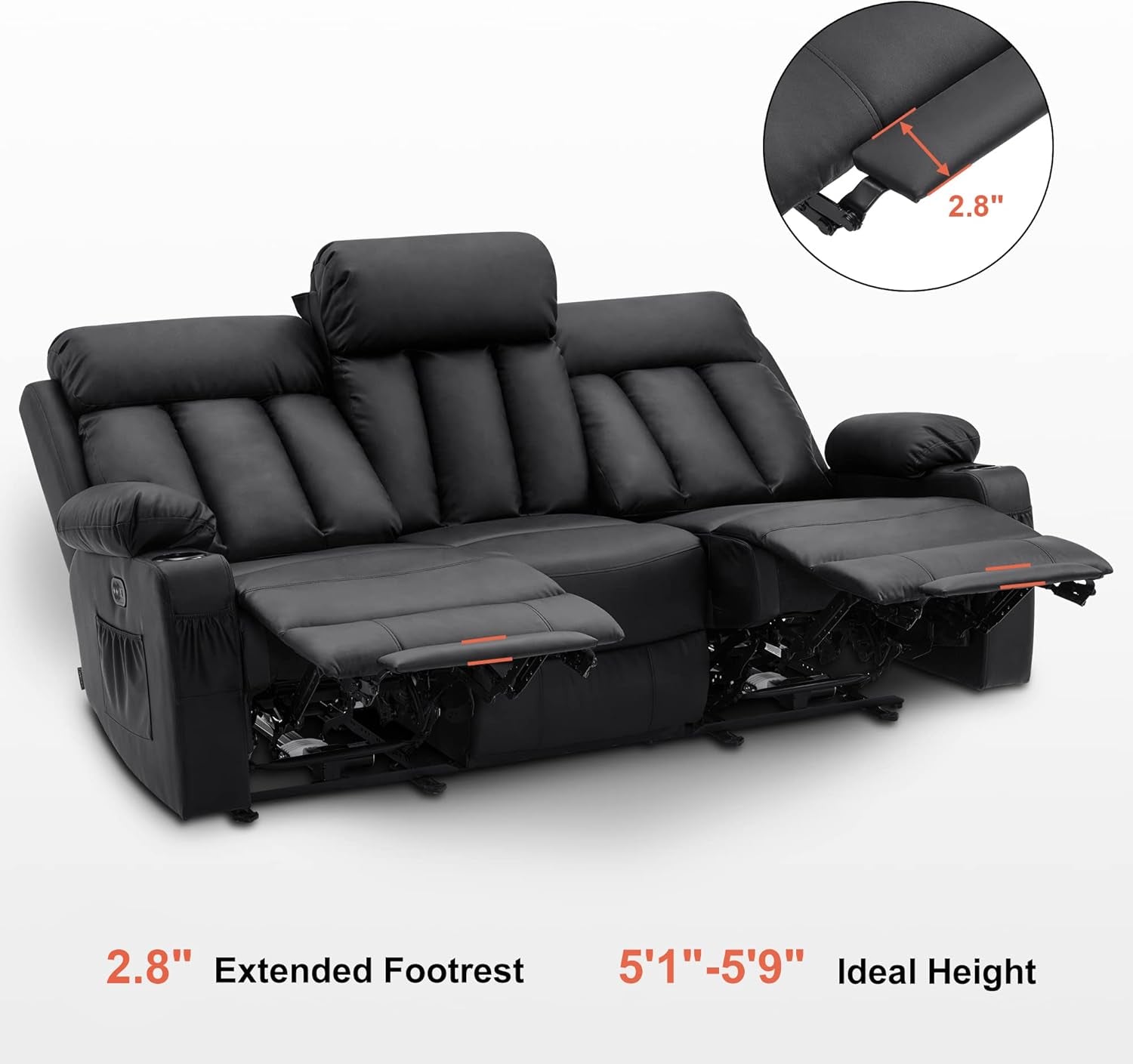 - Key specs: Max reclining angle 140°, full length 70.4", wall clearance 11", weight capacity 320 lbs per seat, recommended height 5'1"–5'9".